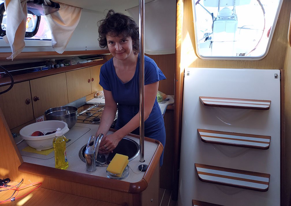 И тут оказалось, что яхта наша хорошо управляема, паруса сбалансированы, она прилично держит курс даже при маленькой скорости. Удобной становится при крене, у нее под крен скошена верхняя часть бортов. Паруса явно новые, их недавно меняли. И ходовая часть тоже новая — нет проблем ни с двигателем, ни с аккумулятором. То есть все действительно критичные вещи были в порядке. А это важнее, чем всякие бытовые мелочи.
