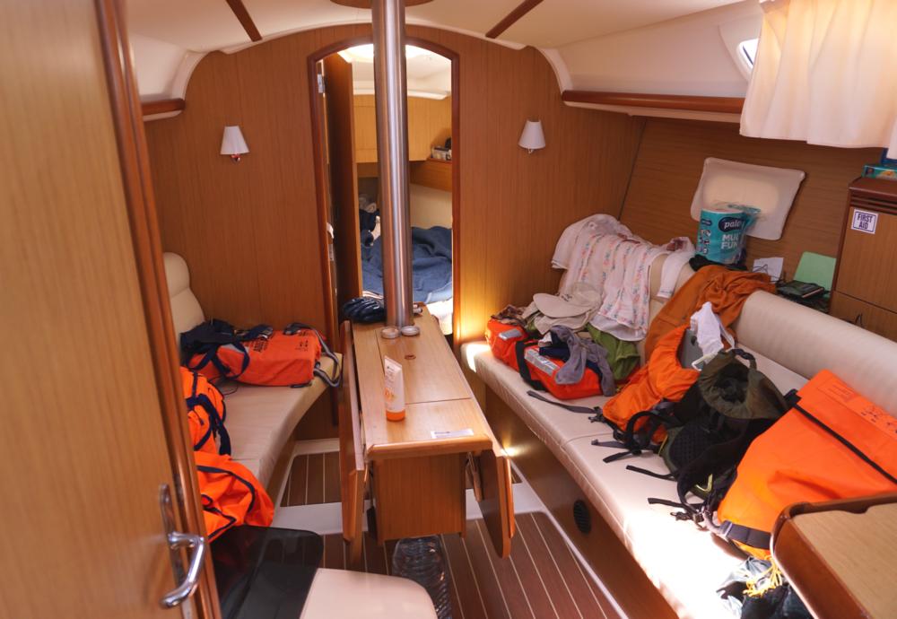 Кают-компанией мы совсем не пользовались, ели наверху в кокпите из-за жары. Поэтому ее закидали спас-жилетами и мелкими рюкзачками.