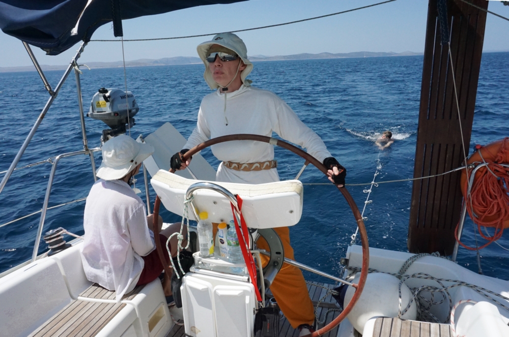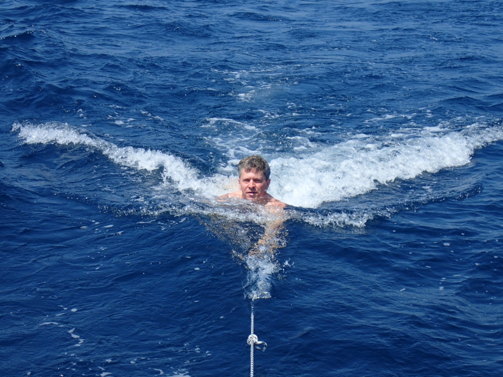 Сперва мы стирались, плескались в душе и обедали. Практика показала, что нашего бака с водой хватило на два дня, и еще остается немного. Но воду мы экономили, посуду мыли забортной водой, а пресной только ополаскивали. В основном вся вода уходит на то, чтобы опресниться после купания: в кокпите есть маленький душ, и всякий, вылезающий из моря, выливает на себя 2-3 литра воды. А купались мы по 4-5 раз в день, и было нас четверо.