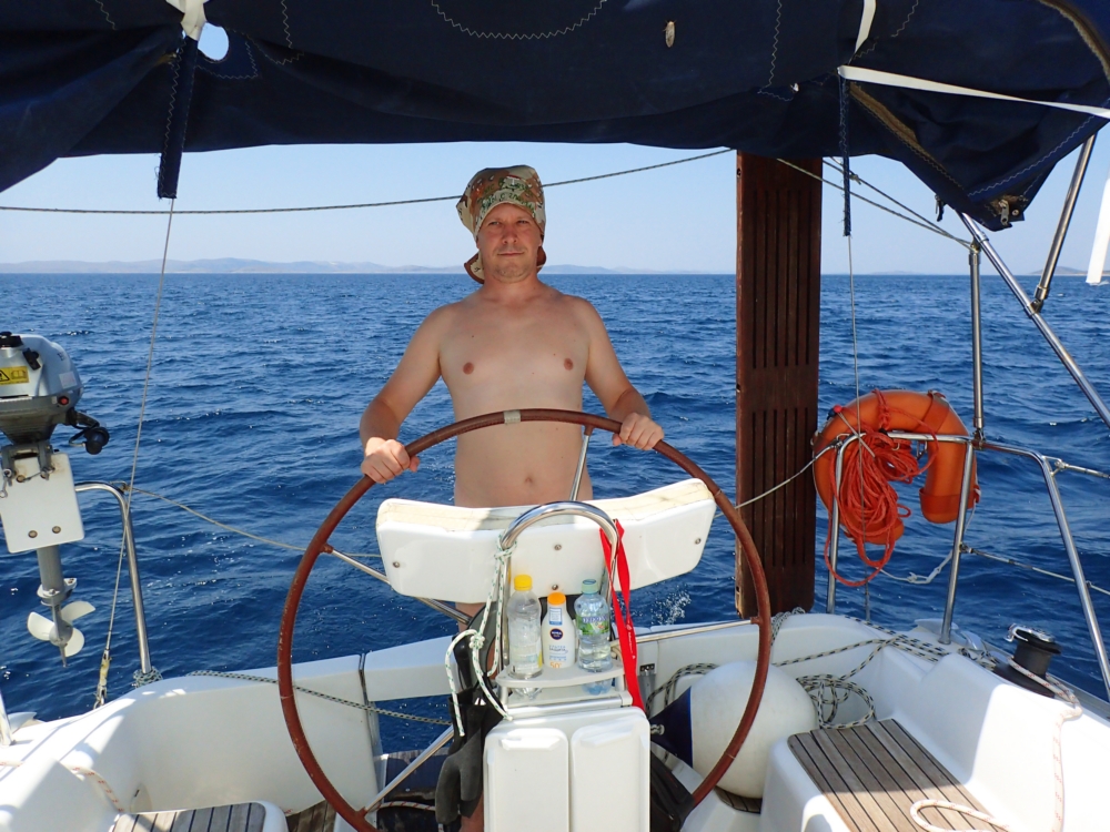 Ветра не было совсем, вода была как стекло. Поэтому сперва шли на моторе и чуть не уснули. Когда все спокойно и ничего не происходит, начинает хотеться спать. Но нельзя! Обязательно нужен впередсмотрящий, даже если включен автопилот. Помимо других судов, в море попадаются сети, их видно совсем с небольшого расстояния, надо бдить. Но Оля сварила нам кофе, и стало легче. А к полудню раздуло и мы поехали бабочкой.