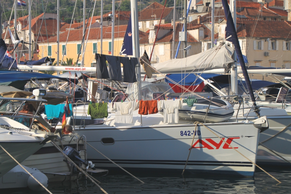 Кто приезжает на неделю, либо берет несколько комплектов одежды, чтобы не стираться, либо превозмогает в потной одежде. При дневной температуре +35 всё очень быстро пачкается. На две недели одежды не напасешься, поэтому мы не стеснялись и стирали ее в маринах. А потом вот так смешно сушили.