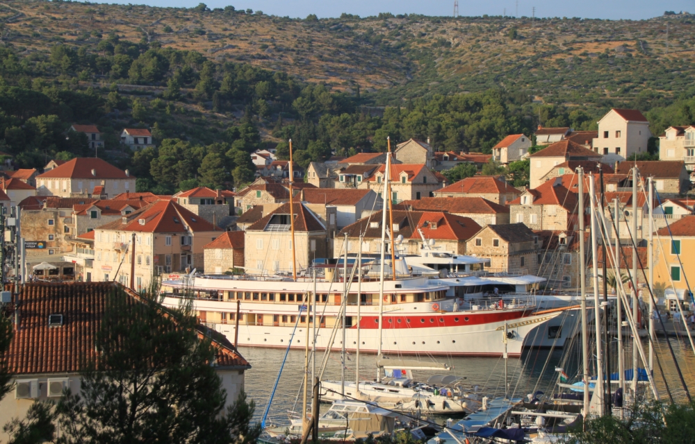 Искупавшись и пообедав, пошли в сторону Стариграда, думали встать на якоре рядом с городом. Но долго колбасились на бейдевинде, ходили галсами, брали рифы то первые, то вторые. В результате не успели дойти до города, встали в начале бухты слева, там есть стоянка на буях за 180 кун. Прошли в тот день 30 миль за 7 часов.