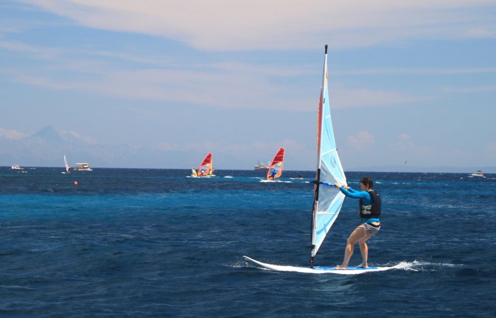 А вот Оля и Леша сплавали на пляж и взяли покататься доски с парусом.