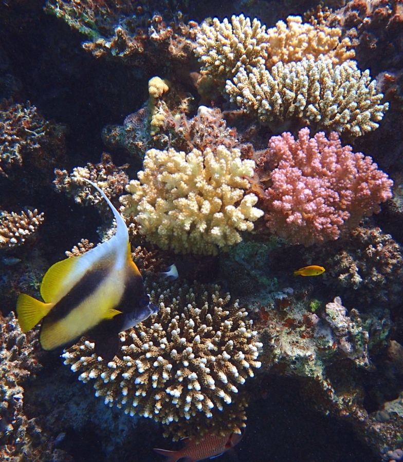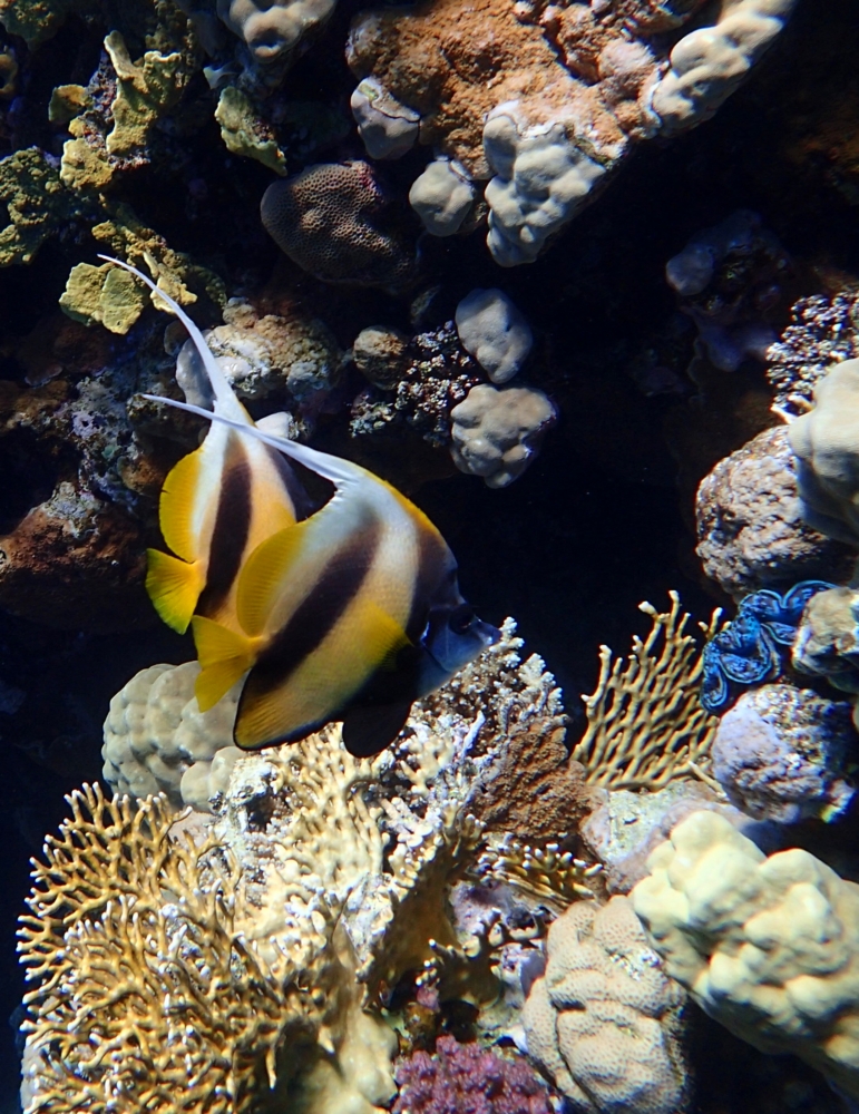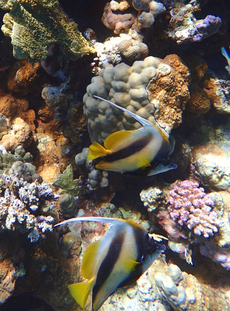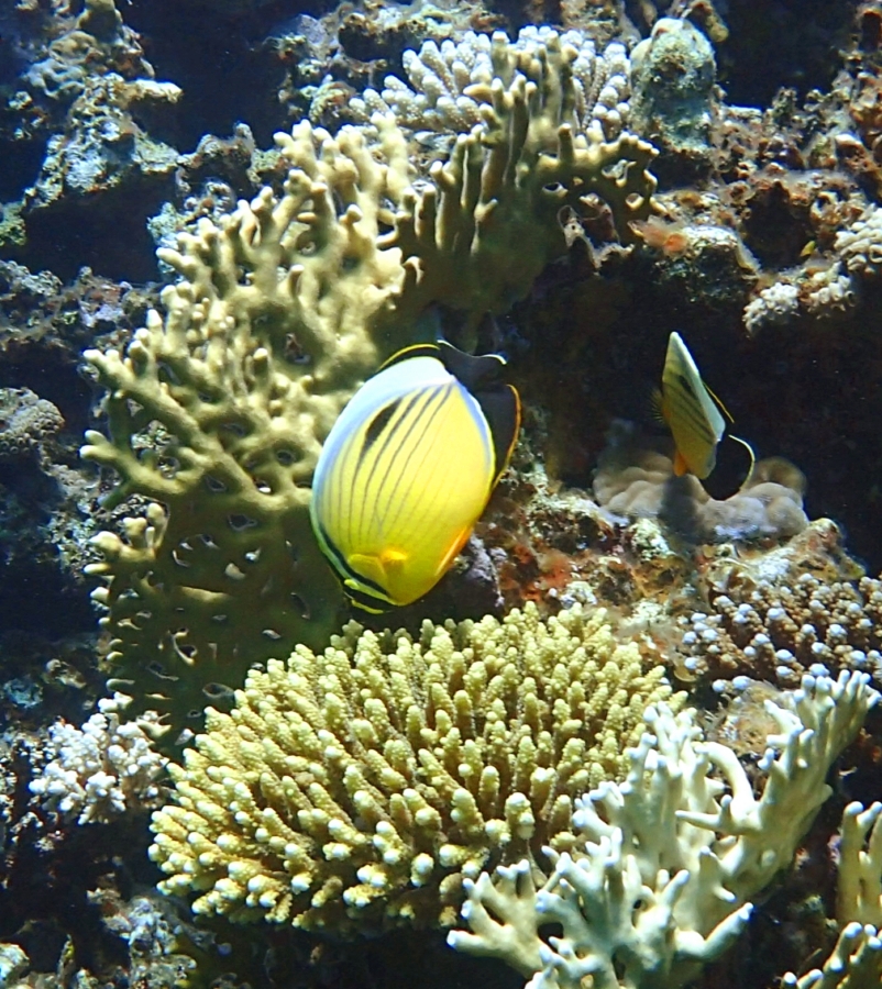 Она фотогенично и спокойно плавает боком. Не то, что шевронная рыба-бабочка над ней, которая уже просто не знает, как ей извернуться :-))