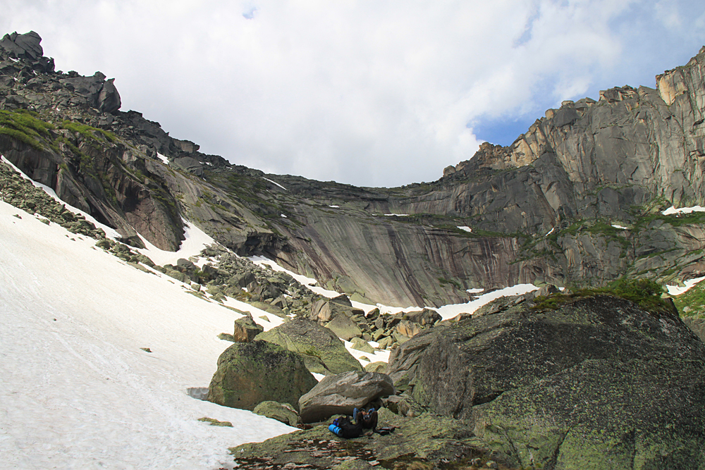 Перевал категорийный, 1б: здесь есть куда падать, особенно когда не стаял снег. Нам пришлось пересечь несколько весьма крутых снежников, где не помешали бы кошки. Но кошки остались дома.