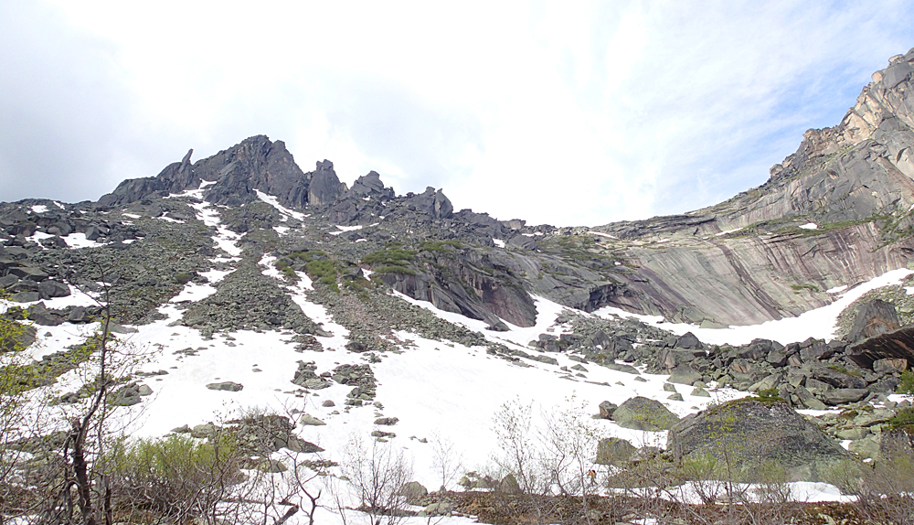 А вот и единственно возможный спуск - сыпуха со снежниками.