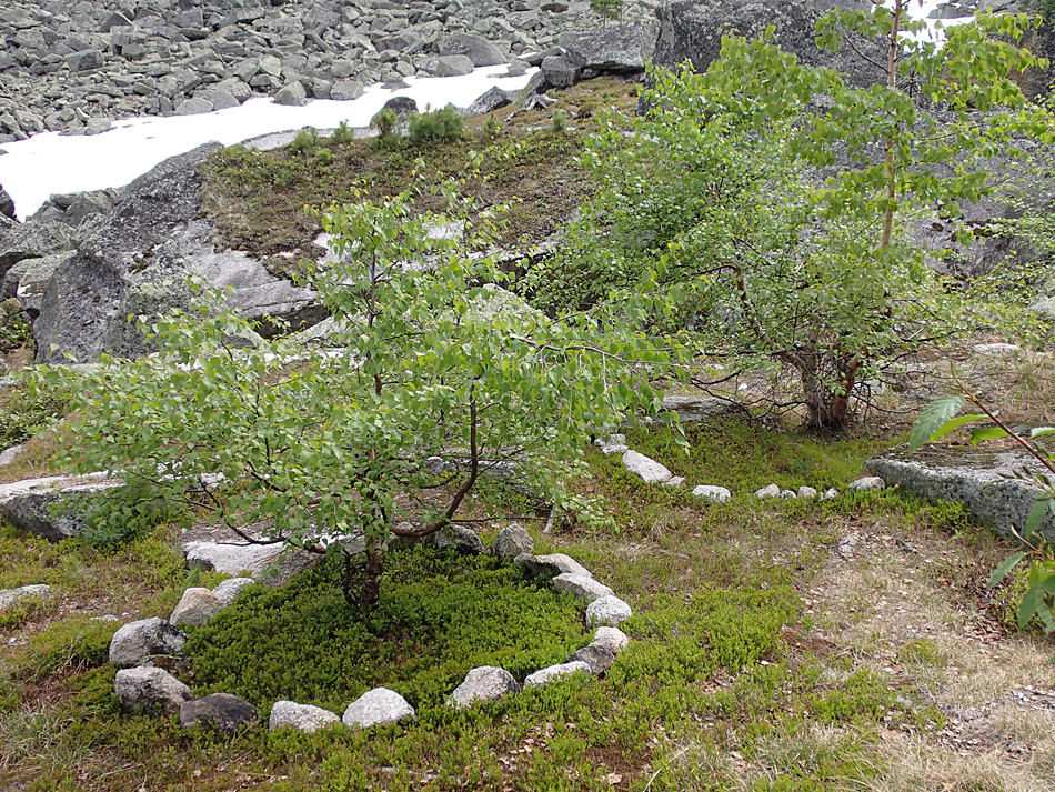 Маленькие березки возле стоянки кто-то обложил камнями и получилась клумба.