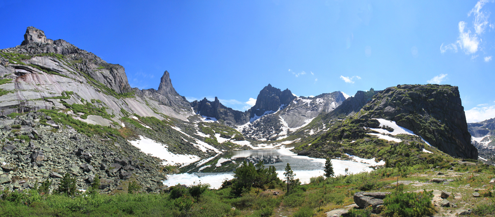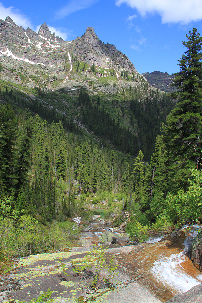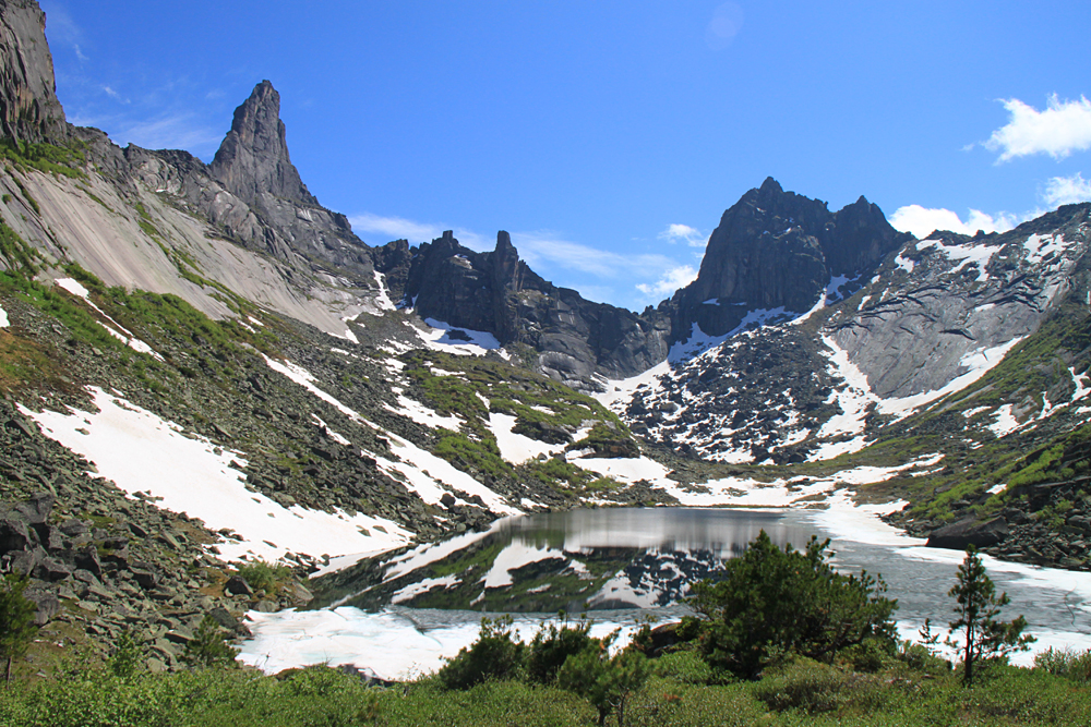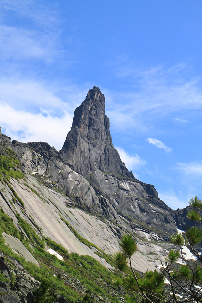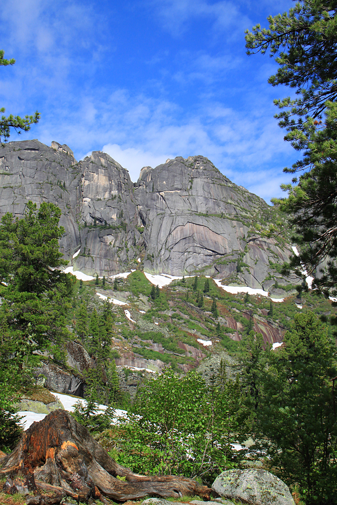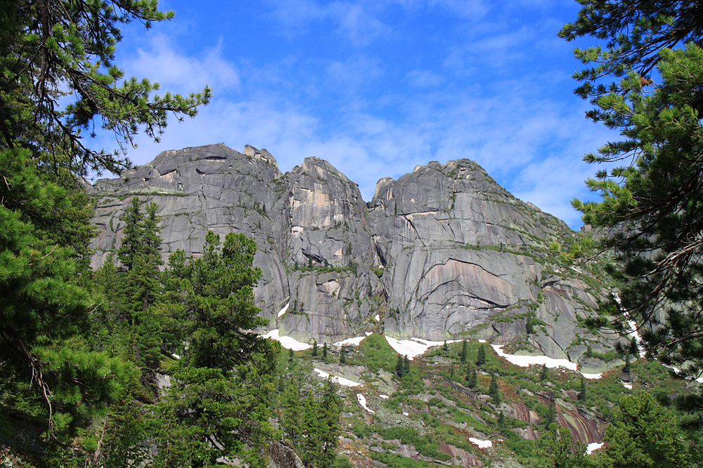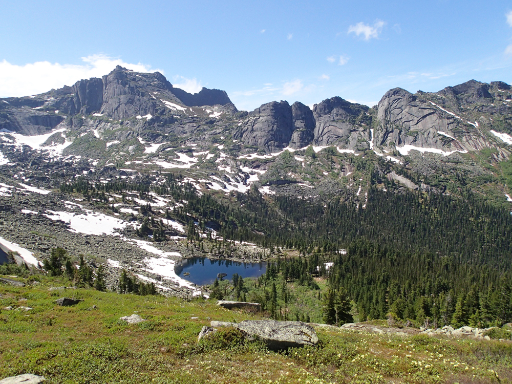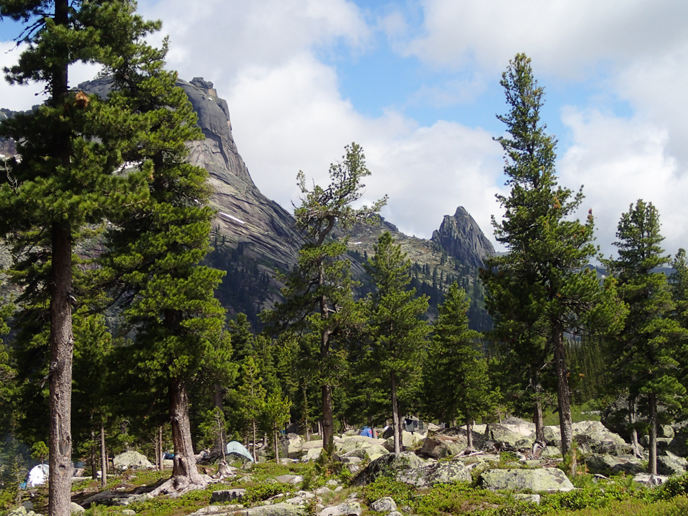 Очень замечательный, самый высокий пик в районе (2260) и один из весьма сложных для восхождения. Надо сказать, что скалолазы в Ергаки ходят, но только со стороны озера Светлого, внутри района я их ни разу не видела.