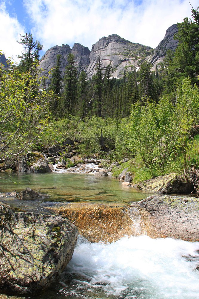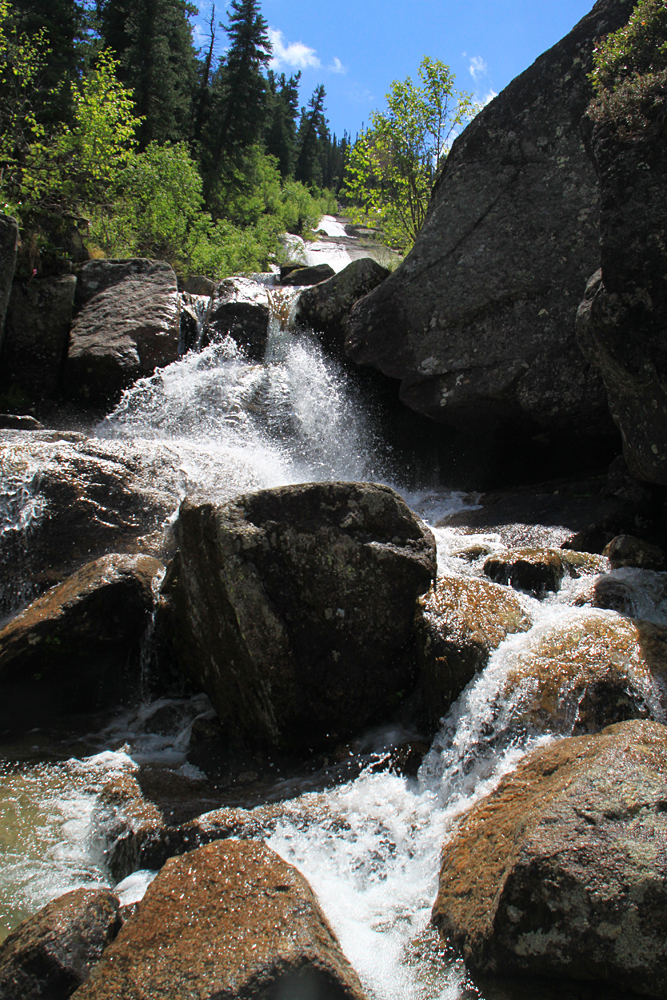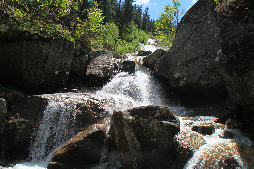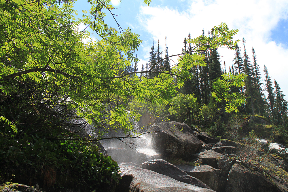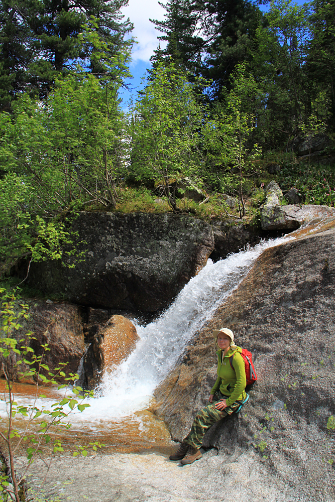 А мы помочили ноги, перекусили и стали подниматься наверх. Выше озера Художников тоже есть несколько водопадов, а вытекают они все из озера Горных духов.