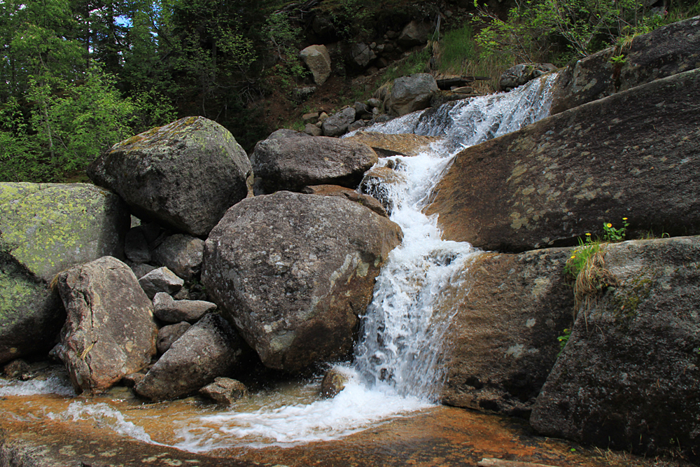 Основная тропа спускается справа от потока, но можно попрыгать по камушкам и перейти на левую сторону, чтобы полюбоваться водопадами поближе.