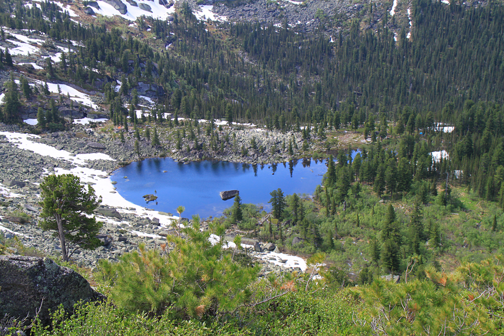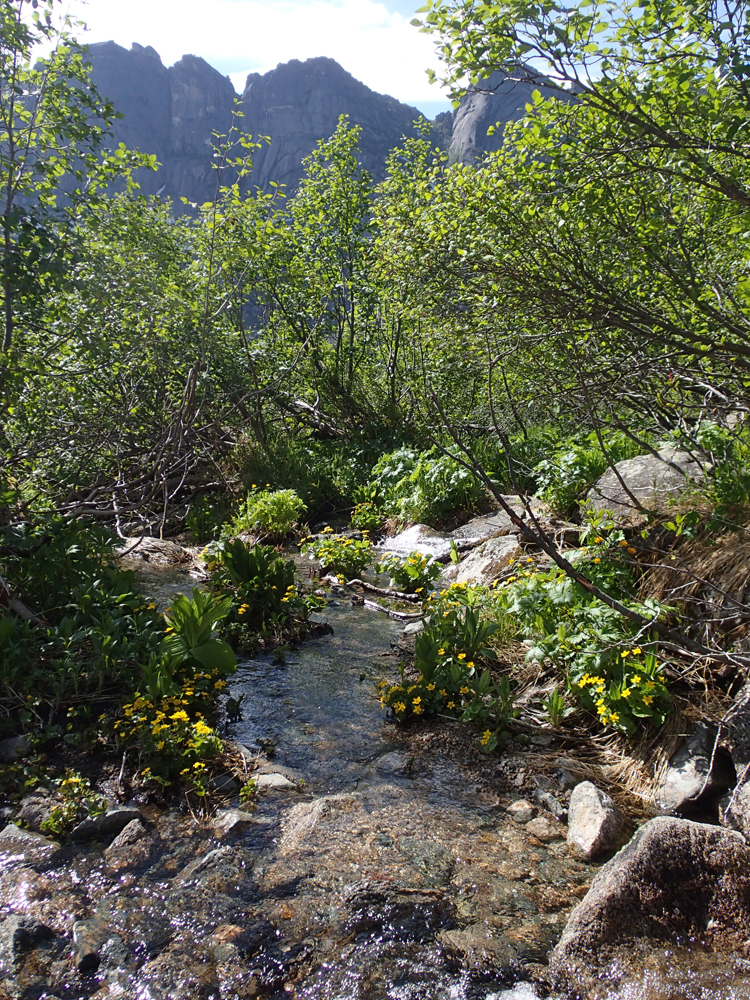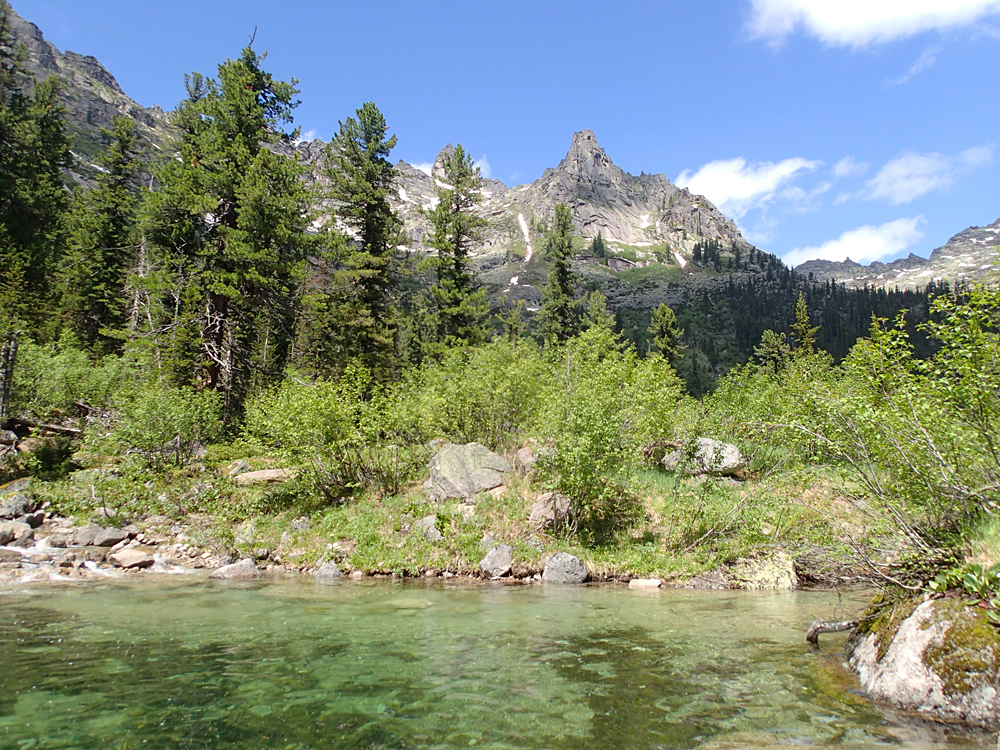 Утром шел дождь и сильный ветер гнул дугу палатки. Но около 11 часов погода резко наладилась, и мы отправились гулять. Это был первый день отдыха после перевала, поэтому прошли мы совсем немного - вниз до Малахитовой ванны и вверх до озера Горных духов.