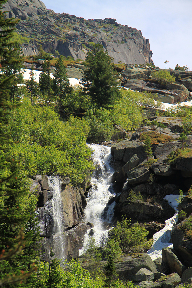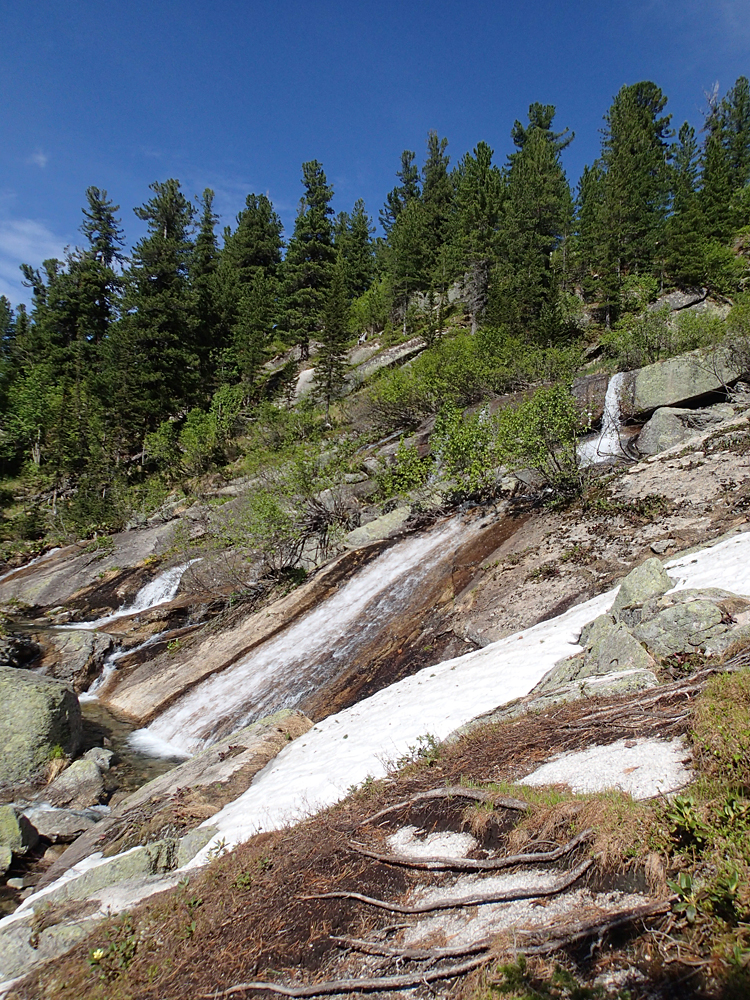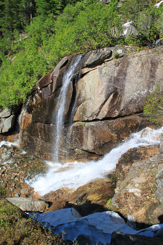 Путь до Малахитовой ванны интересен своими водопадами. Мы были как раз в правильное время - снежники наверху тают, воды много, вокруг молодая зелень.