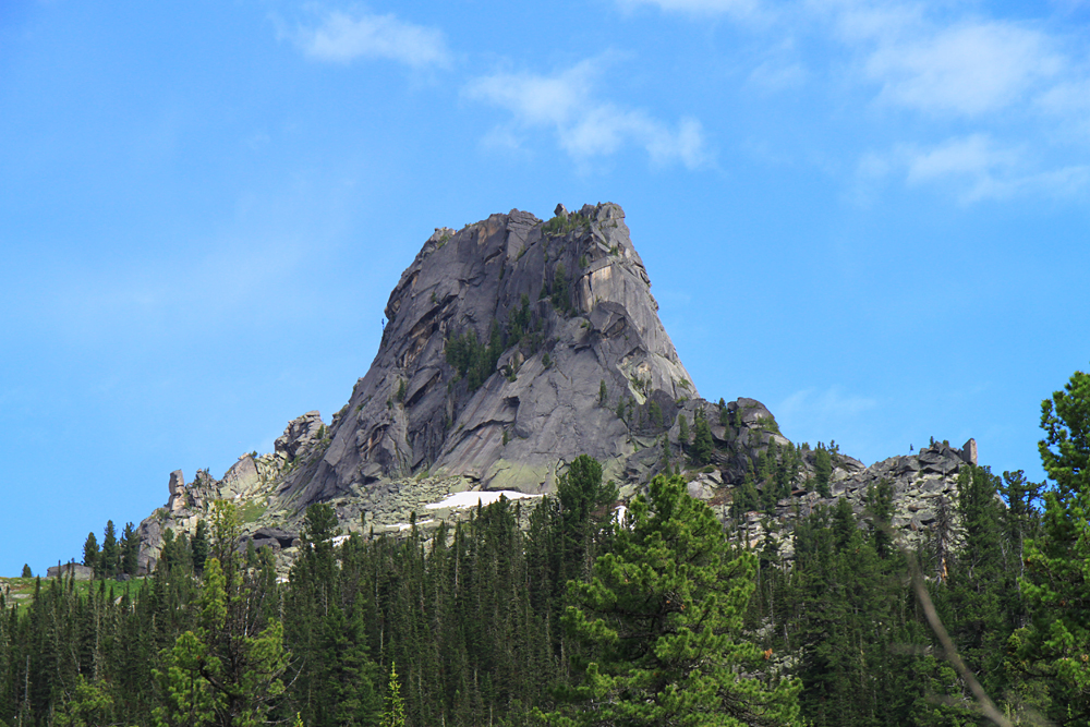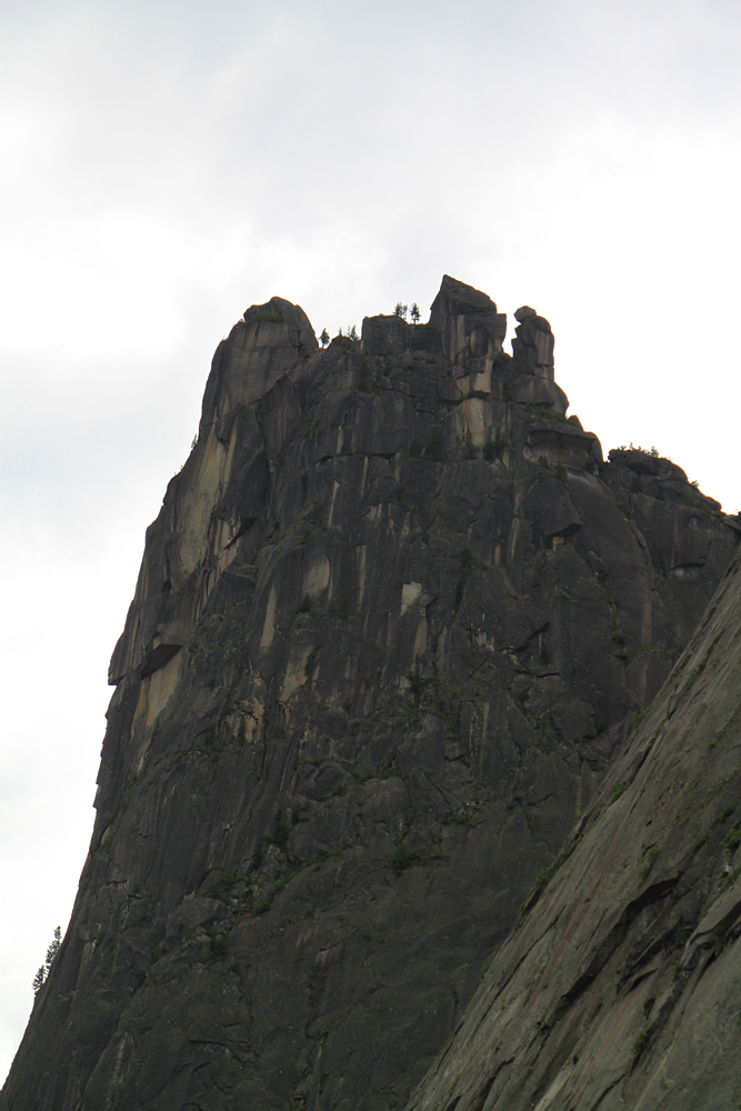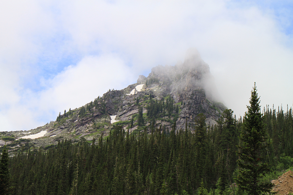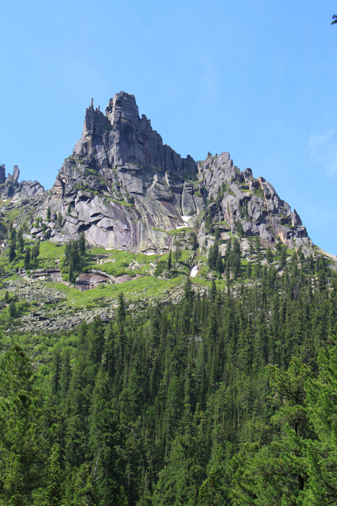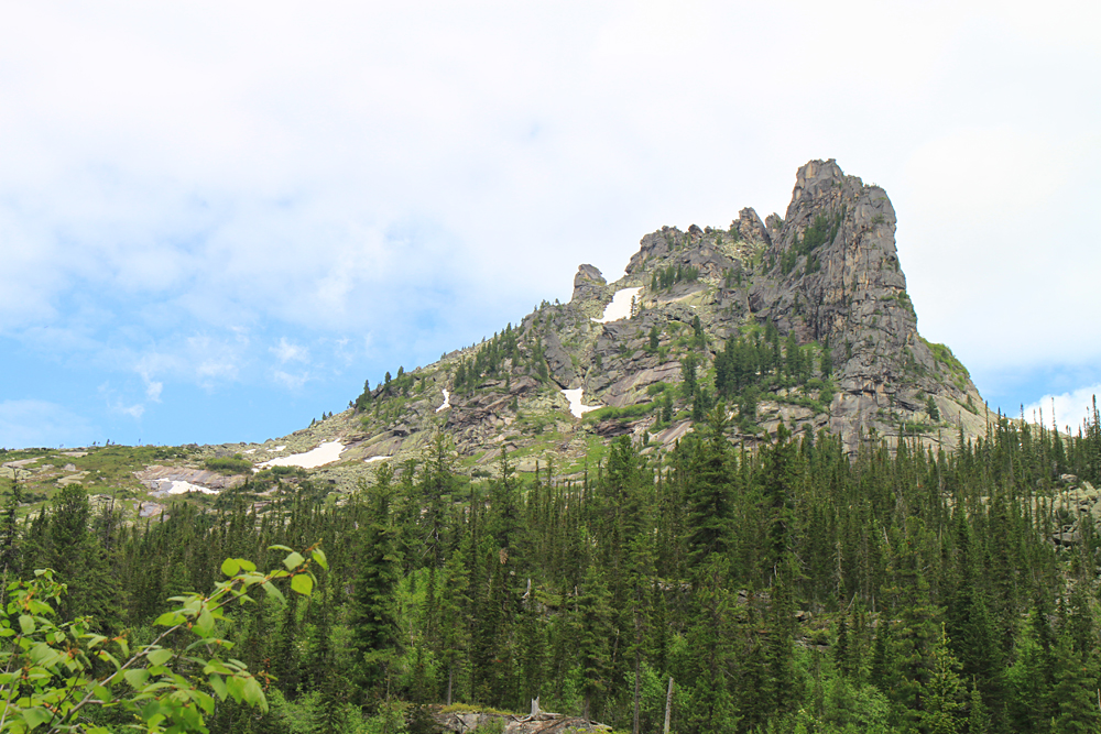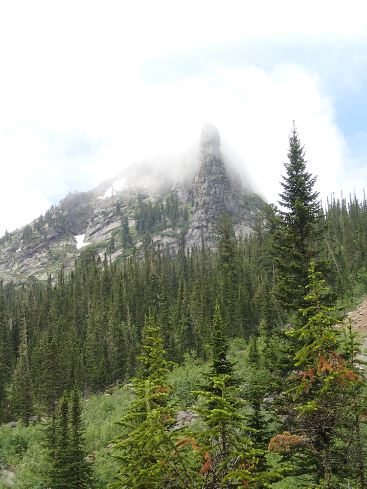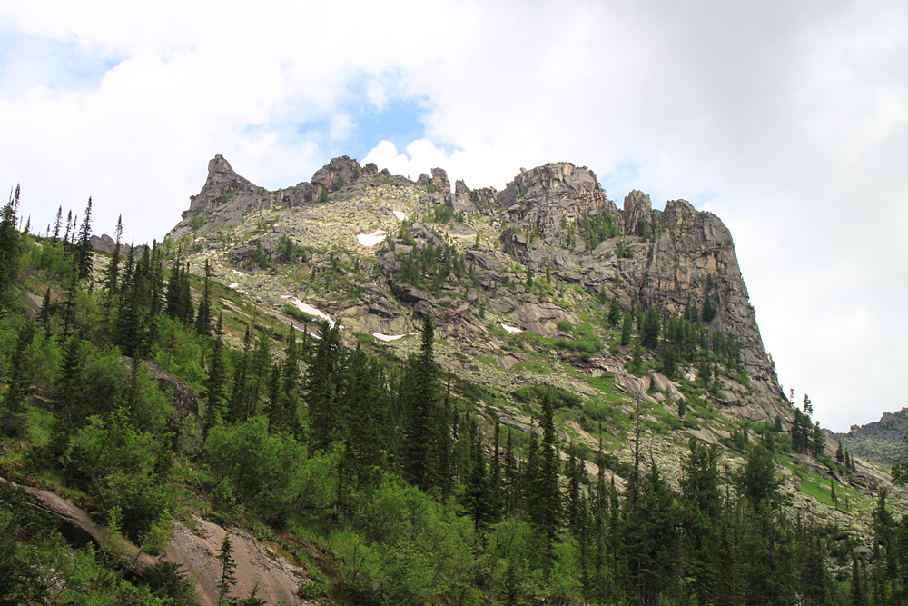 Сперва мы планировали подняться выше до озера Восьмерка, но тучи сгустились, вдали загрохотало. Пока мы сидели под кедром и жевали свой обед, из-за перевала на нас понеслось угрожающего вида облако. Мы выбрали "чемодан" с карнизом, забились под него и переждали основной грозовой заряд. После того, как ливень перешел в слабый дождь, можно было спускаться вниз.