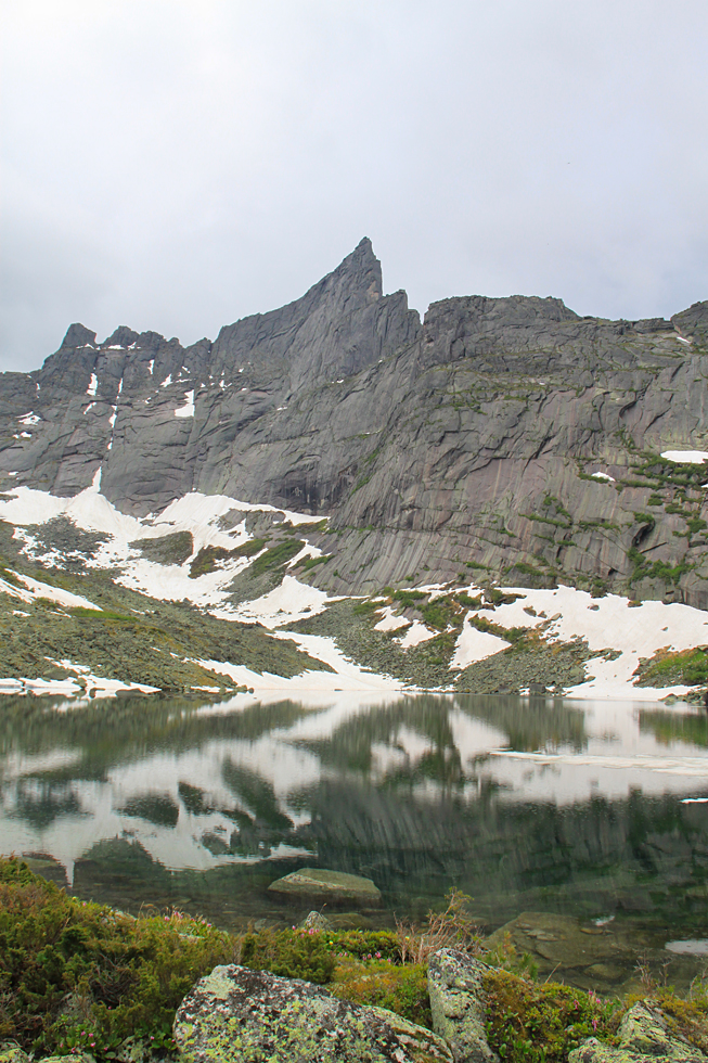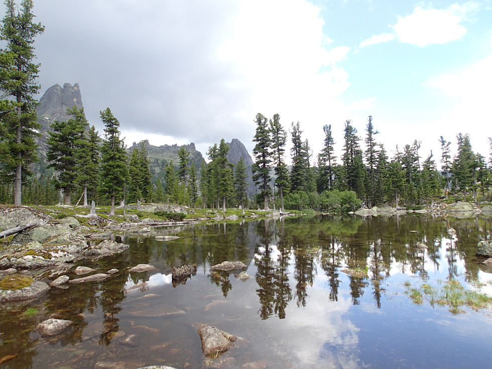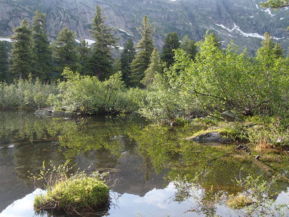 Переждав дождь, мы спустились к Тайгишу, взяли рюкзаки и стали подниматься к озеру Художников. Если бы погода была ясная, мы бы пошли ночевать на озеро Горных духов. Но тучки создавали неопределенность, и сидеть в сырости и тумане не хотелось. Оттого мы опять встали на озере Художников, только в этот раз на его восточном берегу, поближе к тропе на Птицу.