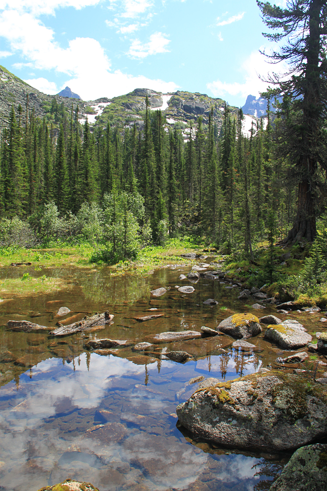 Мы поступили хитро: собрали рюкзаки, донесли их по нижней тропе от Стрелки до поворота на озеро Тёплое, там закопали их под толстым кедром, а сами налегке пошли вверх. Так нам не пришлось возвращаться за вещами, ведь следующая ночевка наша должна была быть поближе к перевалу Птица.