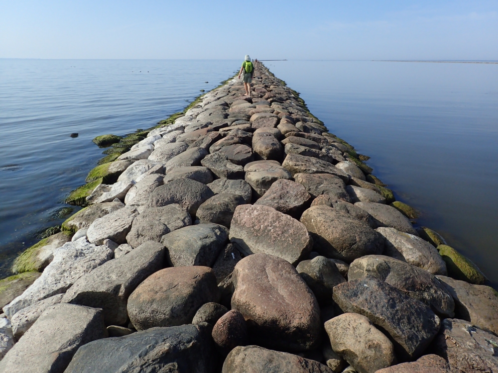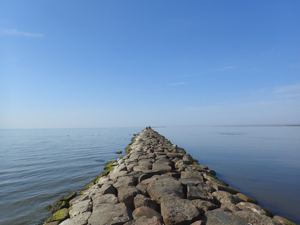 Справа вода условно пресная, если нет нагонных ветров, слева — условно соленая, но разница невелика. Справа для судов прокопан фарватер. Мол затем и нужен, чтобы оставалась хоть какая-то глубина и песок не заметал выход в море.