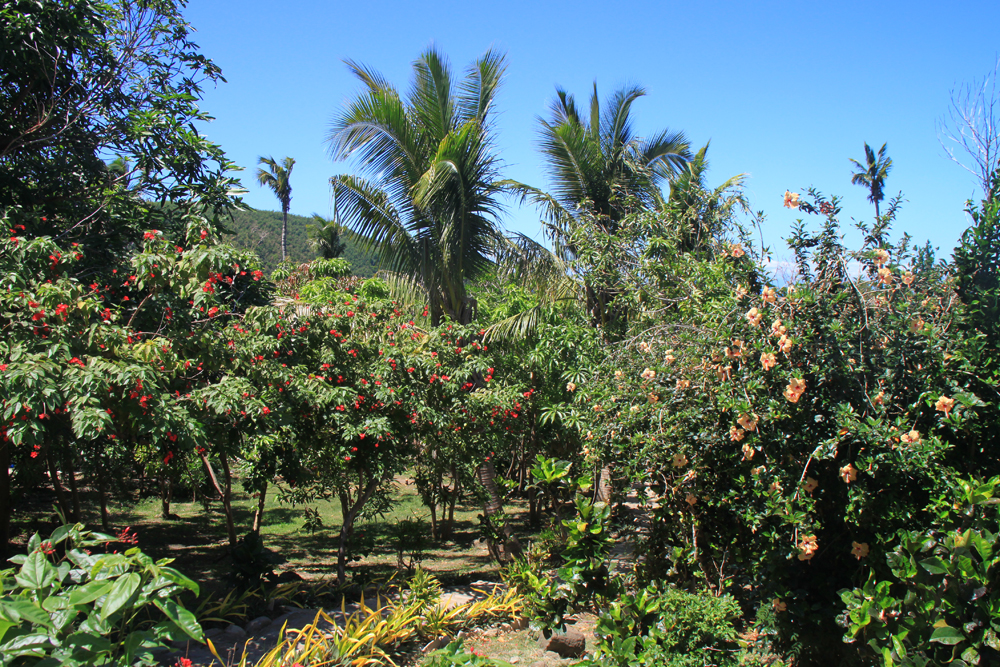 До ближайших бухт можно дойти по берегу, а можно — по центральному холму. Мы шли по верху и высматривали кокосы. Это оказалось непросто, спелых приличных кокосов мы так и не нашли. Пришлось добывать зеленые.