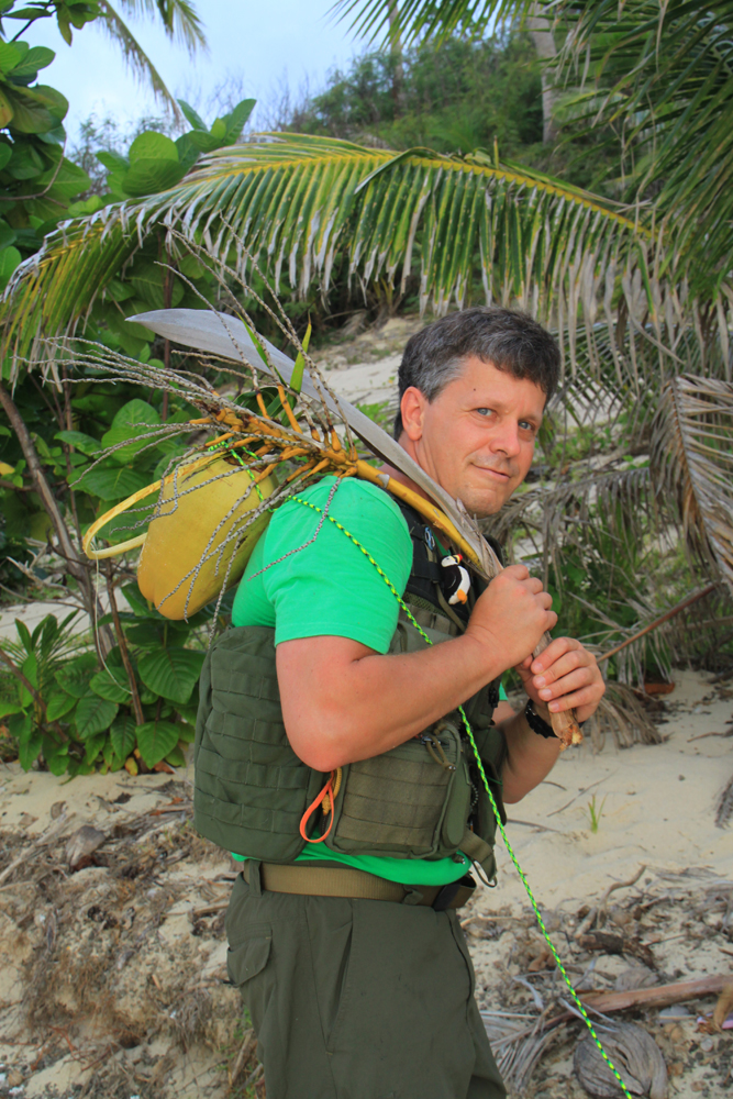Поскольку на пальму мы лазить не умеем, пришлось применить мозг. К палке мы привязывали петлю, при этом армировали ее кокосовым листом, чтобы получилось жесткое баскетбольное кольцо. Иначе кокос не ловился :-)
