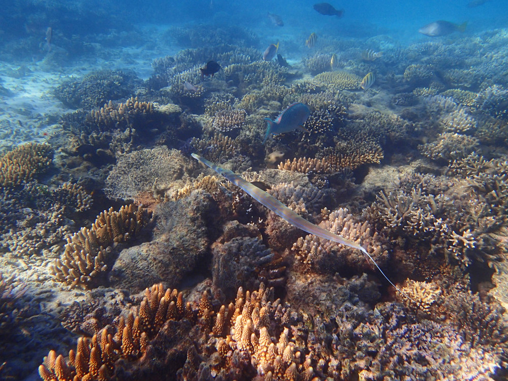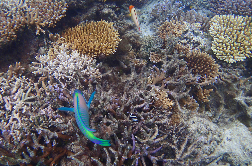 На второй день мы выяснили, что перед ресортом есть замечательный коралловый риф. Самый яркий и красивый из всех, что нам встретились за этот месяц. Плавать там можно было только во время прилива, в отлив становилось очень мелко.