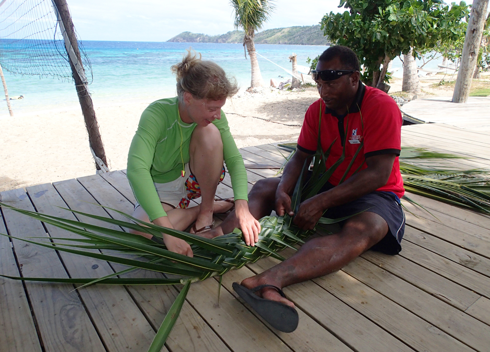 Я под руководством опытного аборигена плету корзинку из кокосового листа.