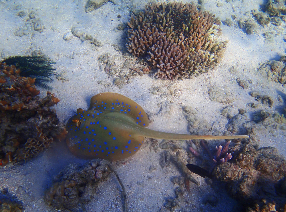 Ресорт на острове так и называется — Mantaray resort. Один или два раза в день наличие скатов поблизости проверяют на лодке, после чего возят туристов поплавать рядом с мантами, если они вдруг есть. Средний скат манта в размахе «крыльев» — 3–4 метра. В отличие от своих электрических собратьев у него нет опасных для человека частей тела. Наоборот, обычно люди их всячески обижают, отчего скатов манта становится все меньше.