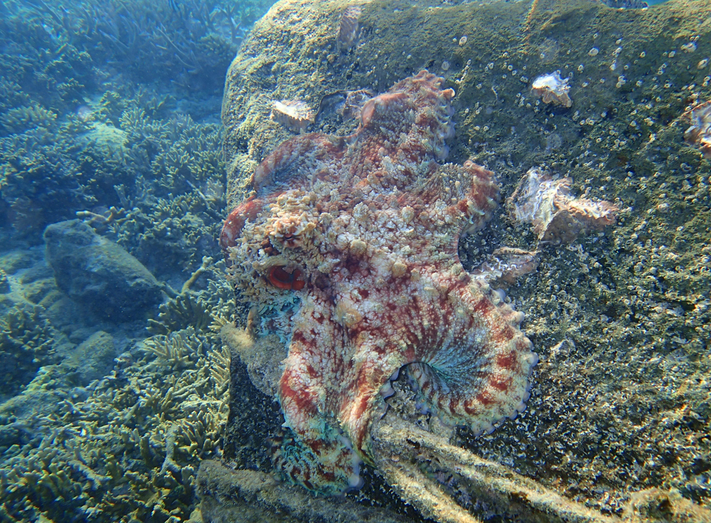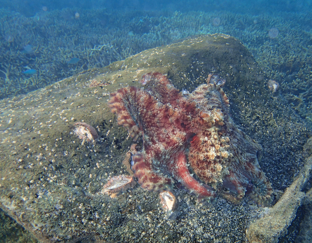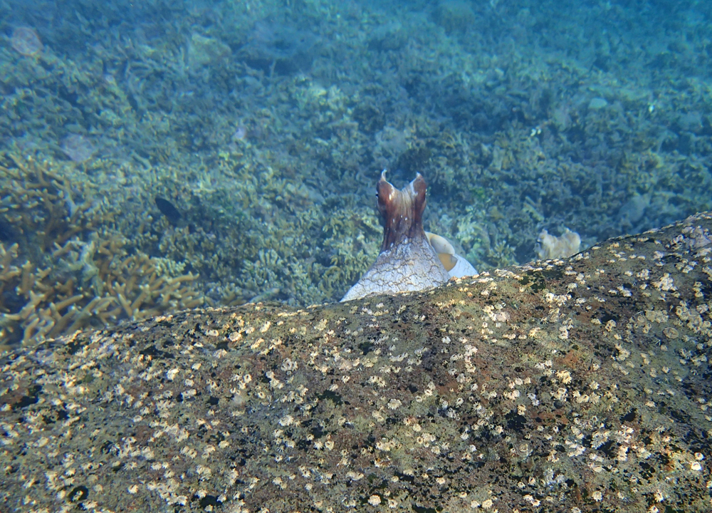 Тут он передвинулся в тень и покраснел. Вокруг растут ракушки, похожие на осьминога :-) Может, его интересовали именно они?