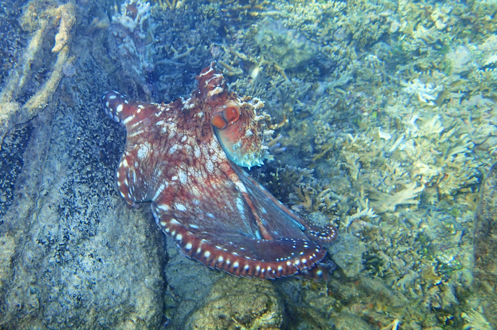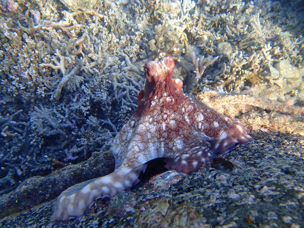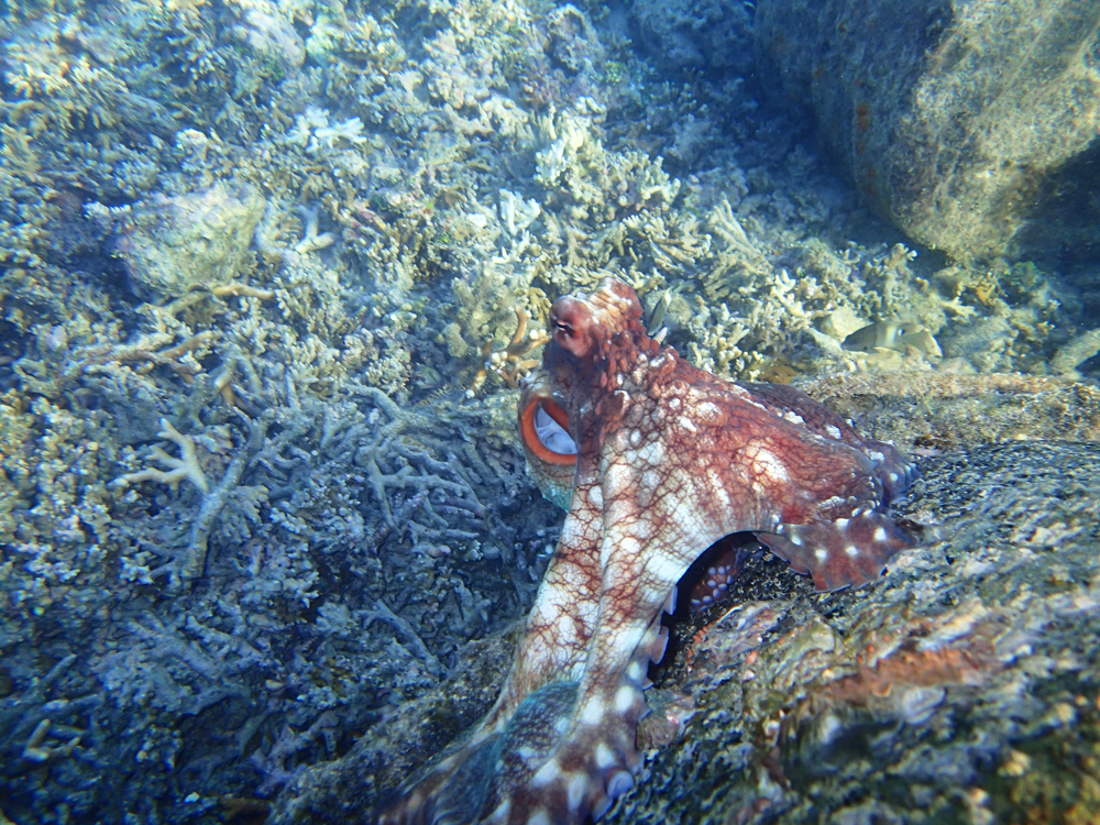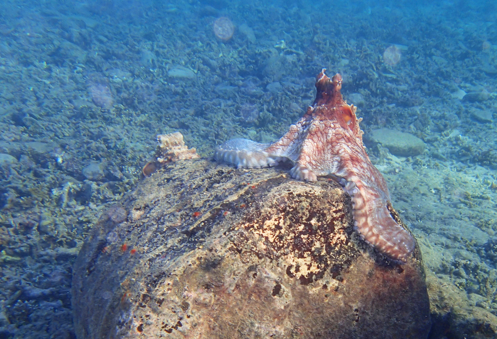 Когда осьминог понял, что мы его не обижаем и просто так не отстанем, он немного осмелел.