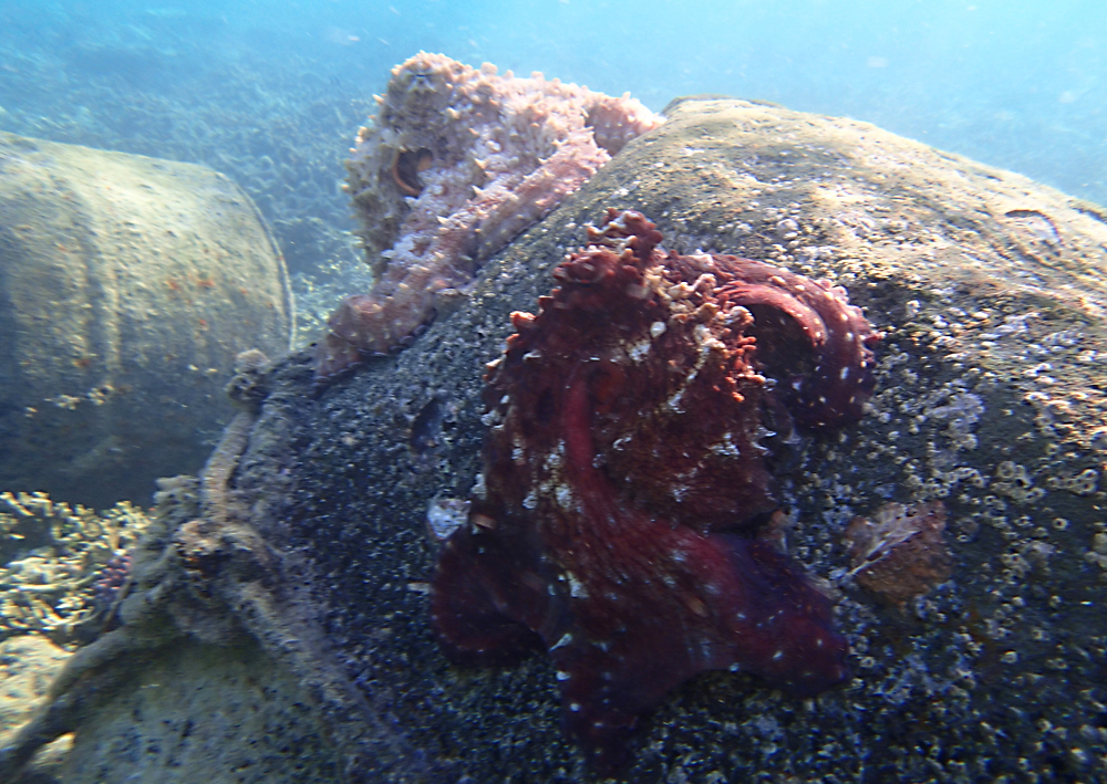 А однажды я нашла осьминогов. Возле берега есть бетонная тумба для привязывания лодок. На ней и сидела наша фотомодель. Если бы он не шевельнулся, я бы его не разглядела, потому что цвет осьминоги меняют отлично.