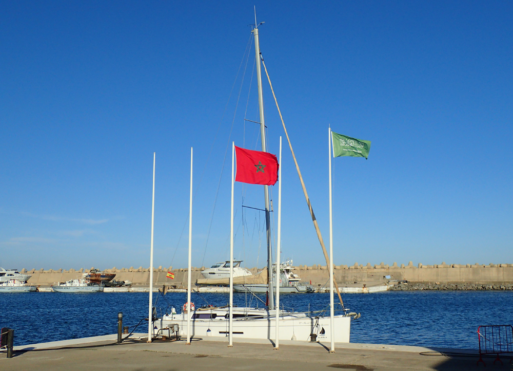 Пока ребята под руководством Алексея проходили марокканскую таможню, я приготовила курицу с картошкой и салат. Уникальный обед — приготовление началось в Испании (или в нейтральных водах?), а закончилось в Марокко. На третий день мы нашли в столе ящик с железными вилками и штопор! До этого ели пластиковыми приборами. Леша наверняка что-то знал, но предпочел, чтобы мы сделали это открытие сами.