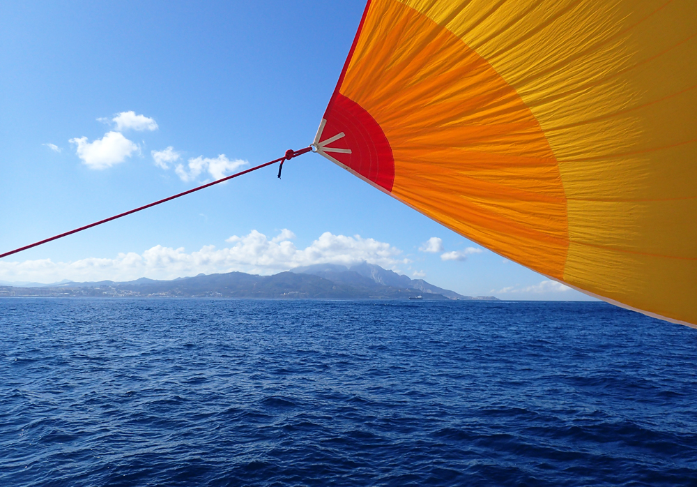 Вышли в 11 утра и шли до трех часов ночи. Оффшорный переход в 86 миль. Сперва до Сеуты пришлось идти под мотором, потому что ветер был встречный. А в проливе распустили, наконец, спинакер.