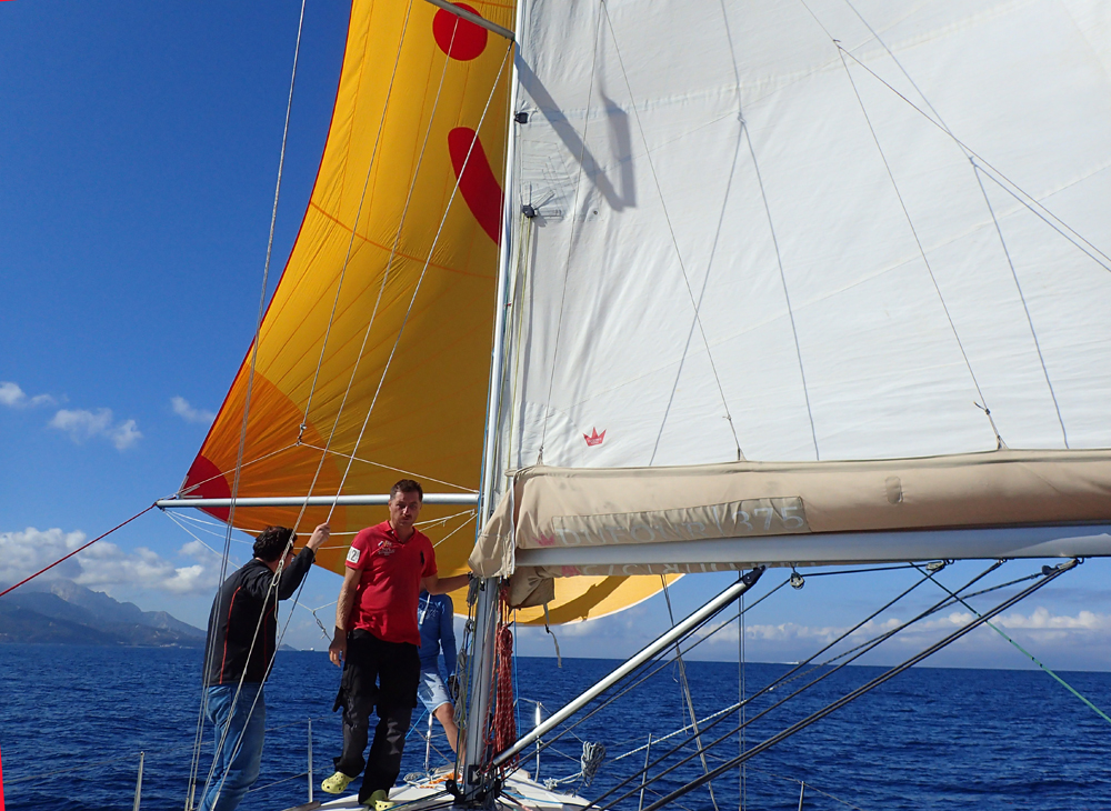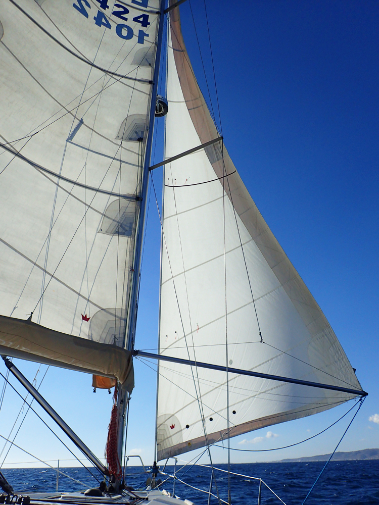 Когда ветер усилился, спинакер пришлось убрать во избежание. Зато мы завели стаксель на спинакер-гик и поехали «бабочкой». Вот так — грот налево, стаксель вправо.
