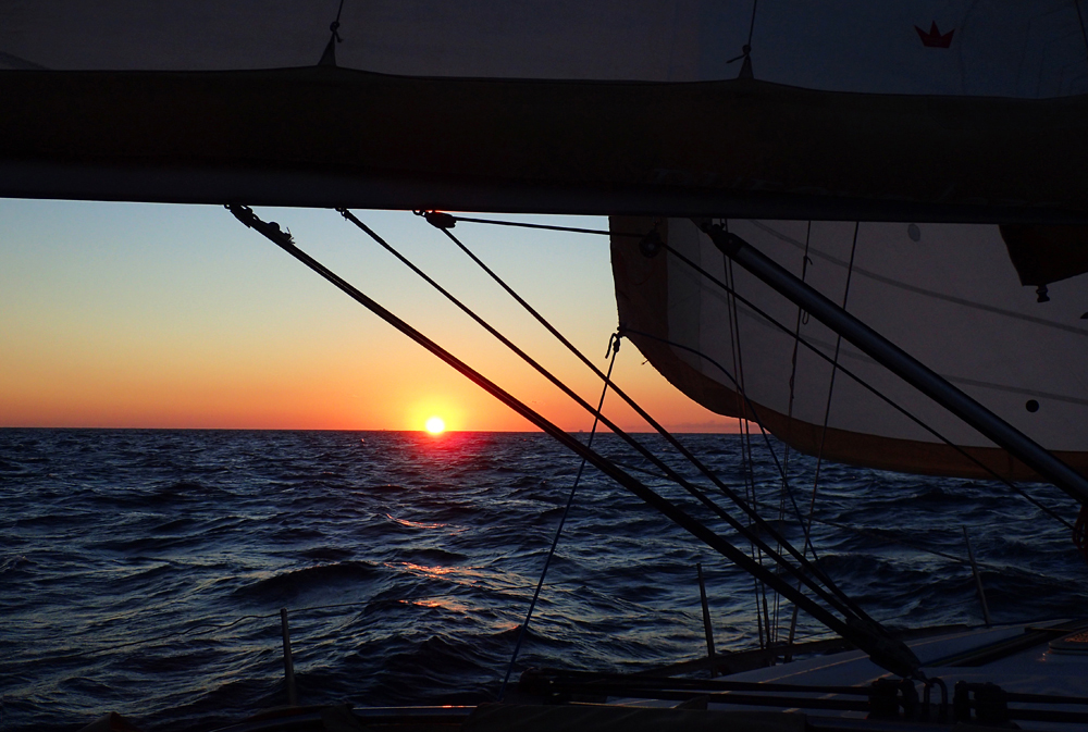 Когда стемнело, мы завели мотор: ночью нам нужны были живые приборы, а аккумулятор давно уже умер. Этот переход высчитывали наши яхтмастера, мы только помогали им обсервироваться. Есть специальный прибор — компас-пеленгатор, по котором определяется пеленг (угол между севером и направлением на объект). По двум или трем приметным точкам можно определить местоположение яхты и нанести его на карту. А потом еще раз. И так весь путь.