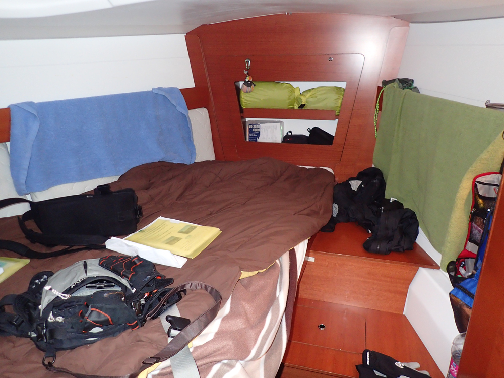 Места для вещей не очень много, справа есть шкафчик и еще всякие ящички в полу. Поэтому на яхту нельзя ездить с чемоданами.