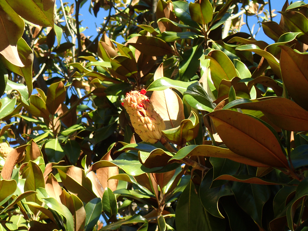 Наш PlantNet рассказал нам, что это магнолия крупноцветковая. К сожалению, цветы были раньше, а сейчас мы нашли на ней плоды.