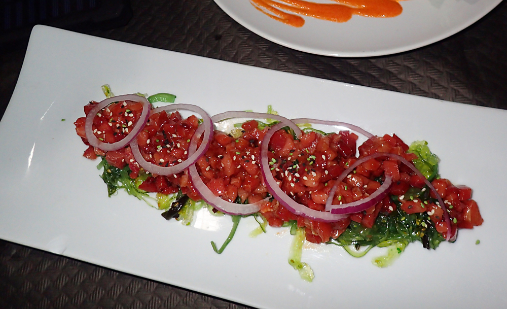 А это тартар, то есть сырая маринованная рыба. С вкусными водорослями.