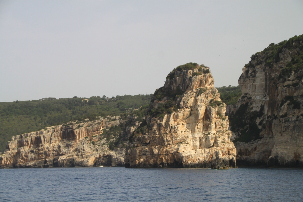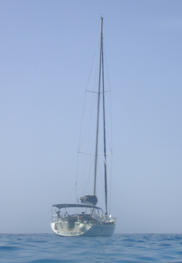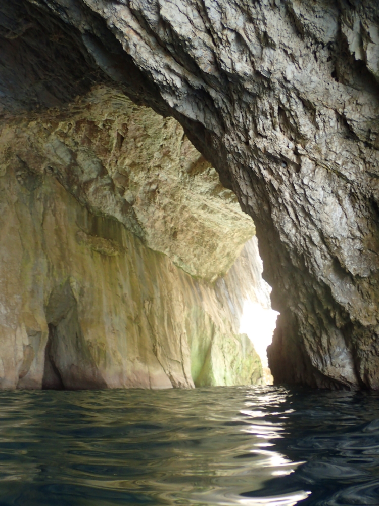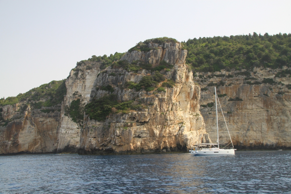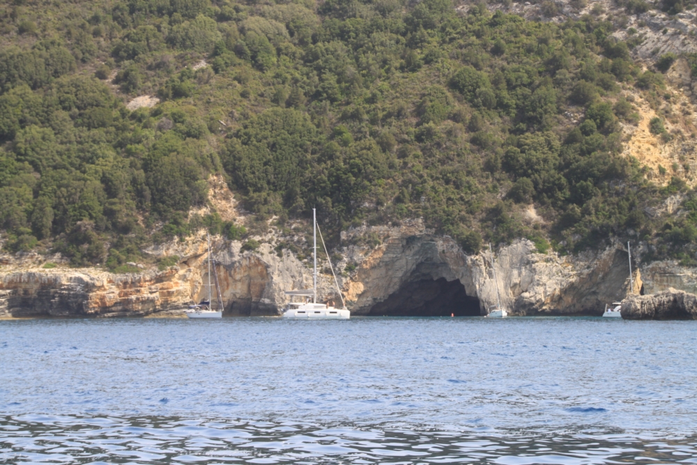 Нам удалось встать справа, хоть и не с первого раза. Там надо было принимать во внимание окрестные скалы, соседние яхты, некоторую качку и плохой грунт, на котором якорь не сразу зацепился. После постановки на якорь сплавали в пещеру по очереди.