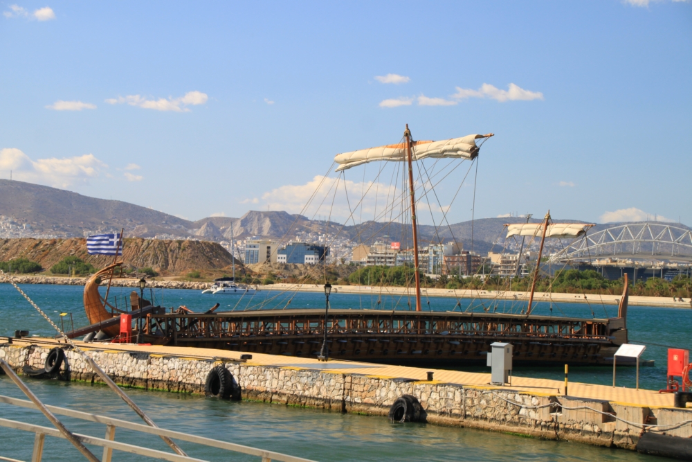Вообще-то это всё морской музей, в который мы не успели: по будням он работает с 9 до 14, а по выходным 10–17, вход 3 евро. Европейцы работой себя стараются не утруждать особо. Поскольку трирему завтра угоняли куда-то на праздник, мы залезли на следующий пирс, состоящий из камней и палок, и рассмотрели её получше.