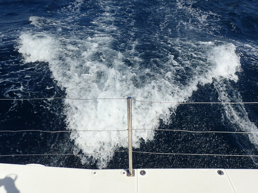 А идем мы на нём очень даже быстро. Вот это 9 узлов, кильватерная струя отстает от нас.