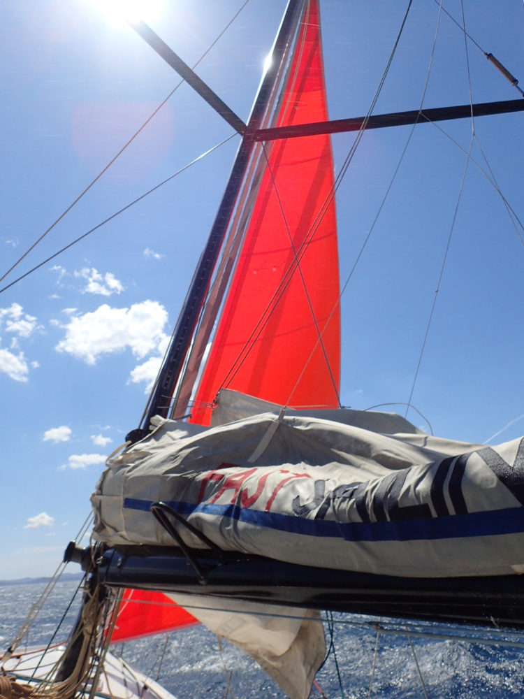 Установили штормовой стаксель. Он у нас ярко-красный, штормовые паруса часто делают такими яркими.
