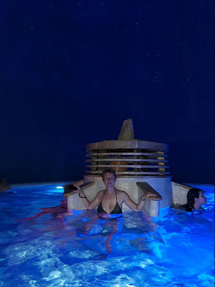 -и еще 5 термальных бассейнов с температурой от +35 до +40, сауны, парная и две купели 16 и 18 градусов. Сауны работают с 12 до 18, кстати.