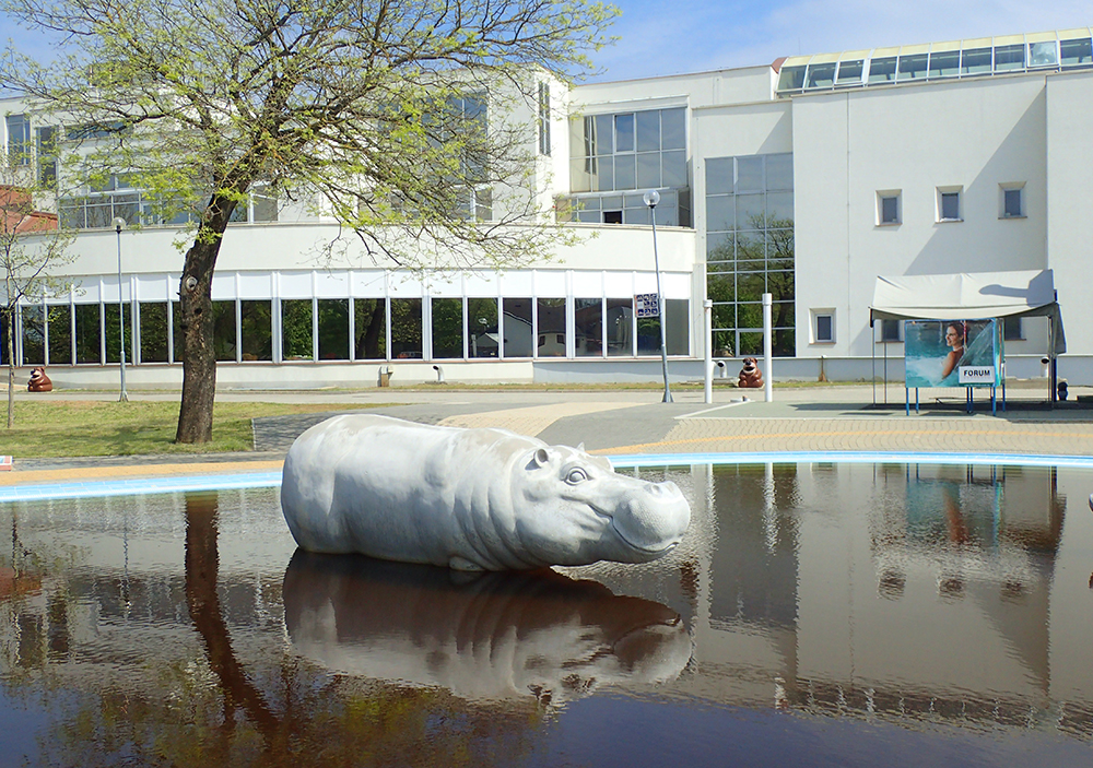 Бегемотик у входа как бы рассказывает вам, на кого вы станете похожи в такой воде.