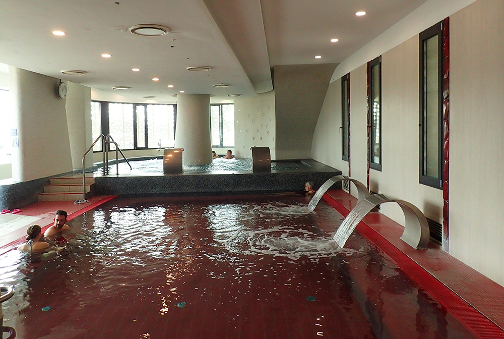 Билет в Лукач стоит 4400 форинтов, кабинки за 1000. Как и в Геллерте, теплый термальный бассейн снаружи всего один и до мая он не работает. Еще снаружи есть бассейны с температурой +22 и +26, мы поплавали в более теплом. В основном вся жизнь проходит внутри, есть 4 бассейна +24, +32, +36 и +40, одна сауна с круглой купельню и одна парная. Тут мало туристов, в основном венгры купаются. Но в помещениях все равно стоит непрерывный гул.