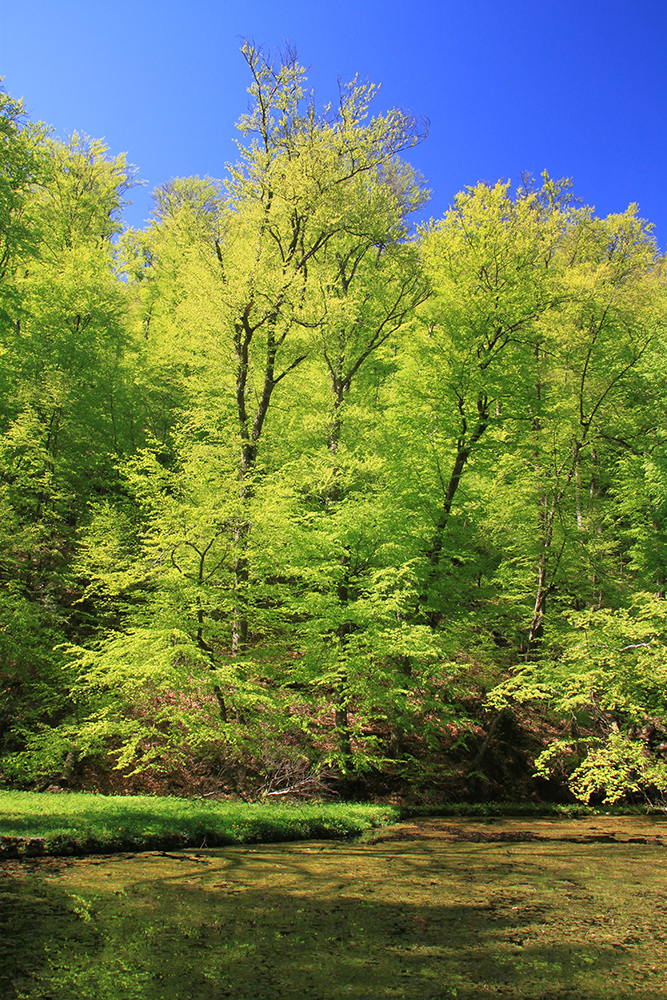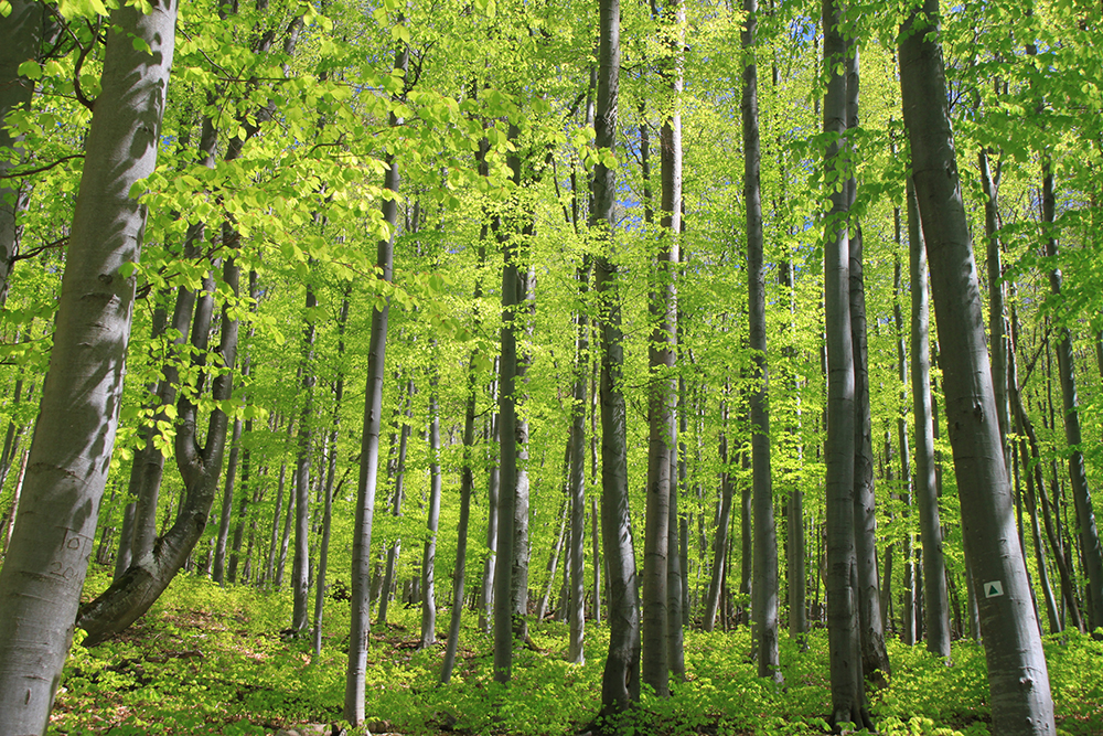 Очень красивый буковый лес с пронзительно яркой листвой и серыми стволами.