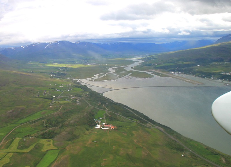 Вылетали мы в очень плохую погоду - двойные тучи, ветер и дождь, все 45 минут полета в иллюминатор не было видно ничего, кроме облаков. Но на севере острова особый климат: это самое теплое место в Исландии и погода там, как правило, позитивнее. Поэтому перед приземлением облака растянуло и мы даже полюбовались кусочком фьорда.