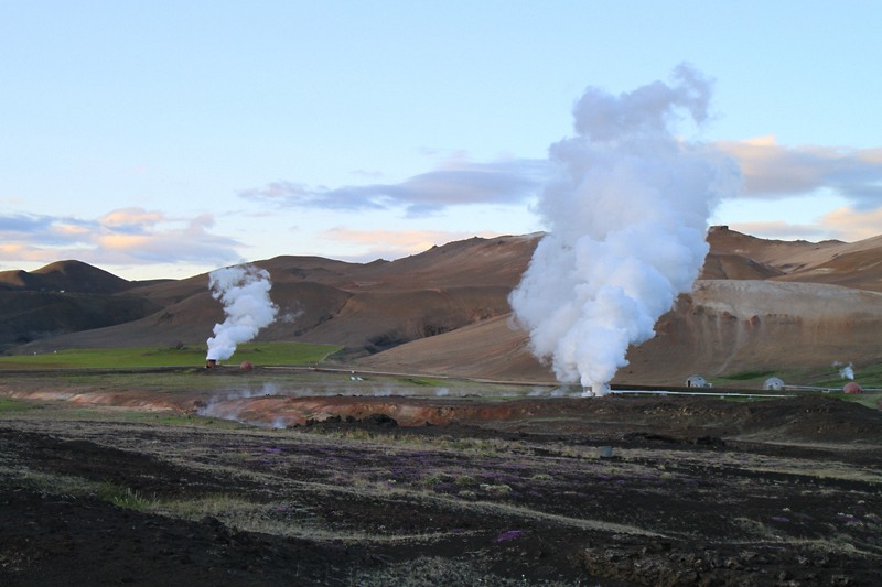 Клубы пара валят из рукотворных колодцев, кипяток тут же промышленно используют. Возможно, это часть термальной электростанции, а может, просто распределитель воды в местные поселки. В своем кемпинге мы умываемся этой же горячей водой.