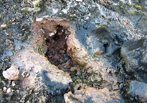 Мы увлеченно знакомились с фумаролами. Это такая дырка в земле, из которой валит пар, а иногда сочится сера и другие представители таблицы Менделеева.
