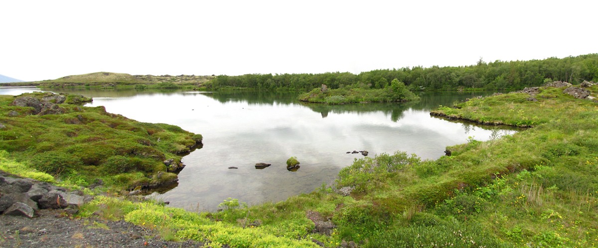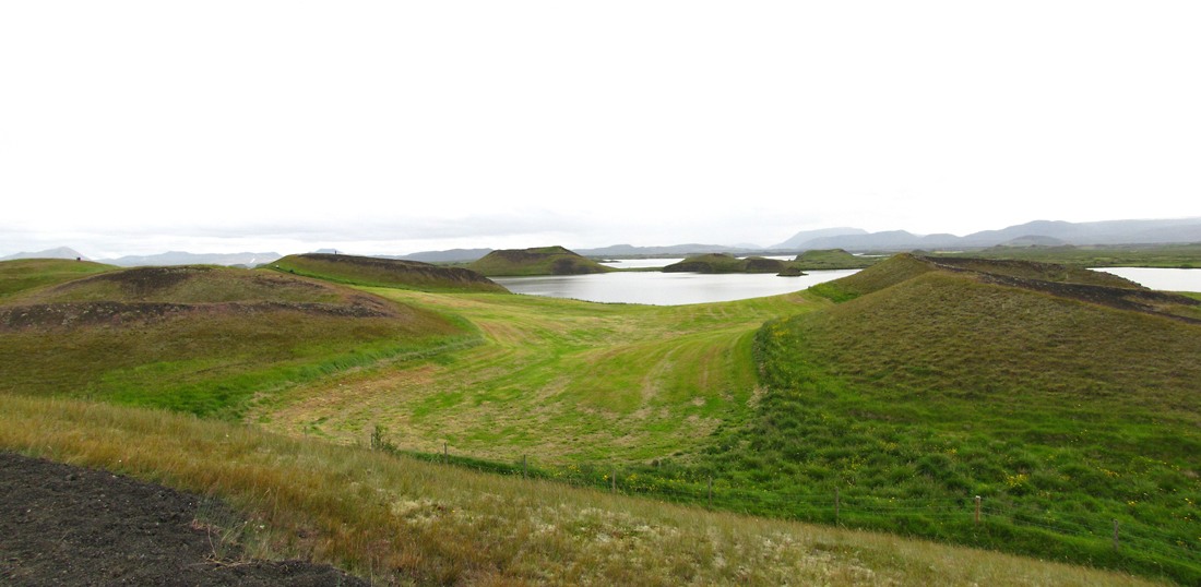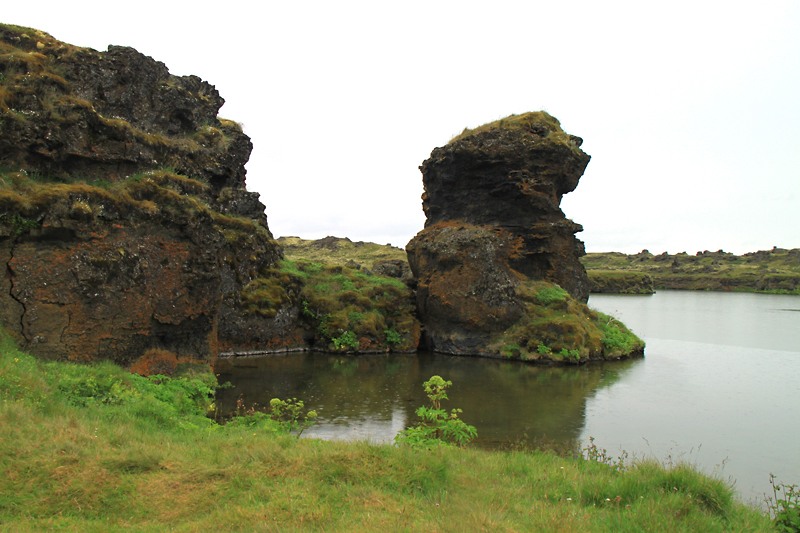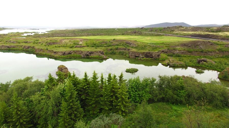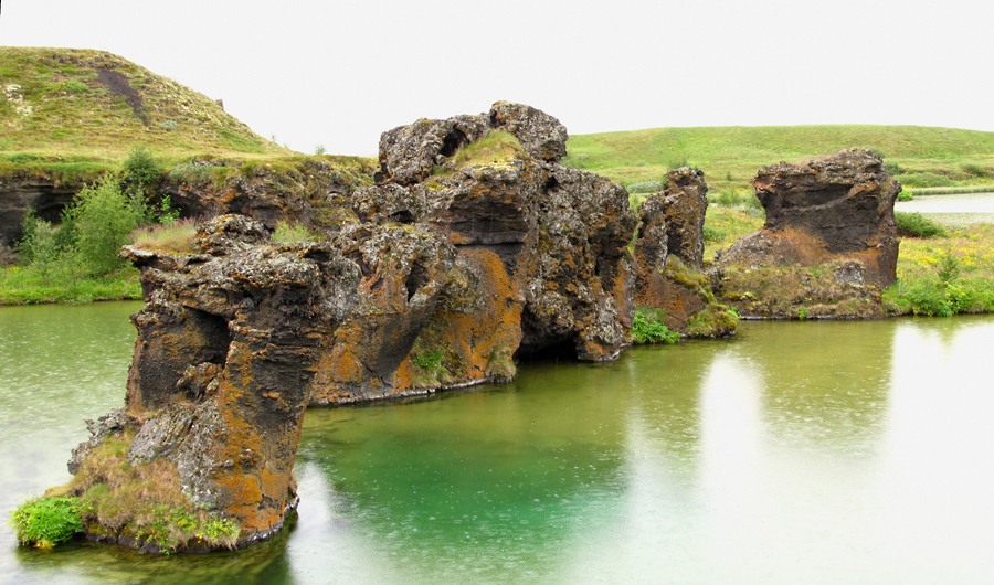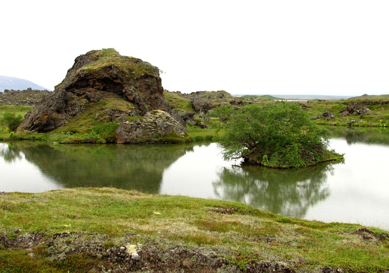 Эта область называется Skútustaðir и характерна поросшими травой кратерами. Некоторые стоят на берегу, некоторые поднимаются из воды.