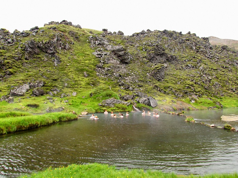 Снаружи +10+12, в реке от +30 до +45 в разных ее участках. Река неглубокая, максимум - метр с небольшим, но ощущения все равно восхитительные. Одно дело - оборудованный термальный бассейн, другое - настоящая горячая река. По ней и назван национальной парк: Место для купания людей (этой) земли, Ланд-манна-лойгар.