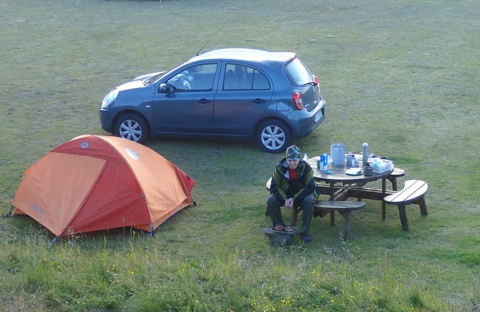 Кемпинг в Дьюпивогуре умеренный (1000 крон с человека плюс какой-то мелкий налог). Есть небольшая кухня под крышей, входить туда надо без обуви (что не очень удобно, когда ты в зашнурованных ботинках). Душ платный (200 кр), одна кабинка для девочек и одна для мальчиков (у мальчиков душ еще и не работал), и вообще на ночь горячую воду отключают. Народу было много, но все вели себя тихо.