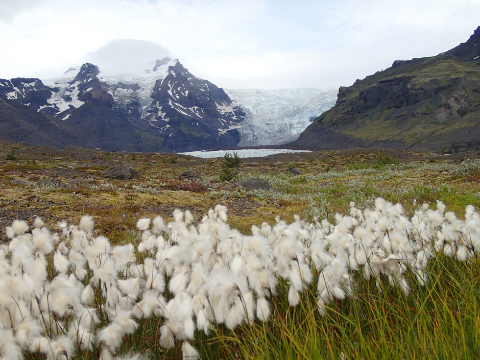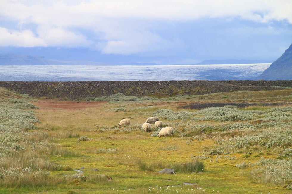 Овечки высохли и пасутся на фоне Скафтафетля. Два ледника находятся недалеко друг от друга.